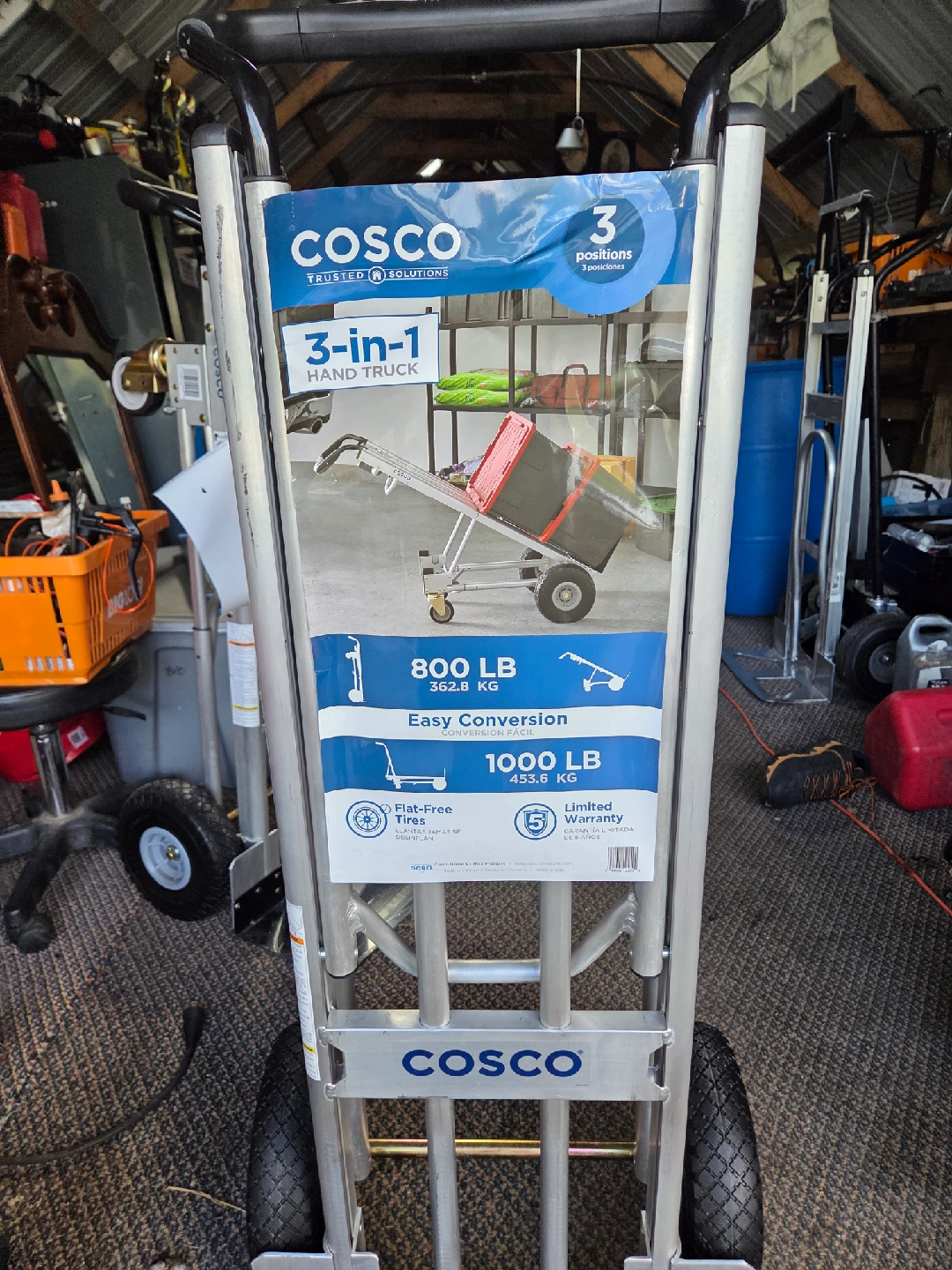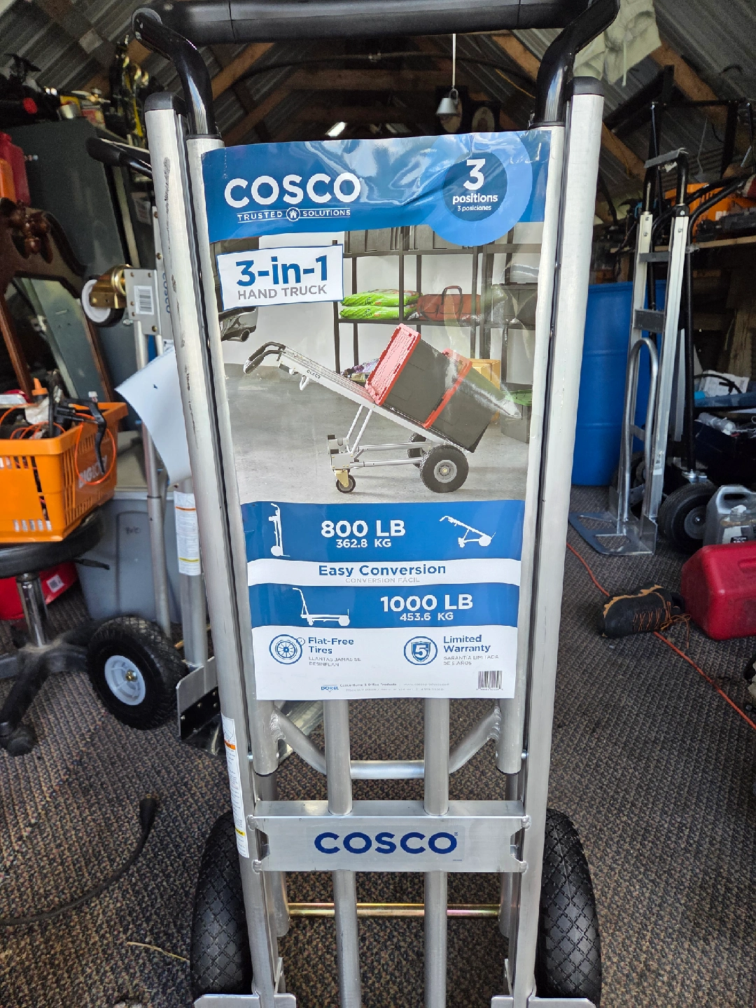 Cosco 3-in-1 Hand Truck featuring: - 3 positions - 800 LB (362.8 KG) - Easy Conversion - 1000 LB (453.6 KG) - Flat-Free Tires - Limited Warranty