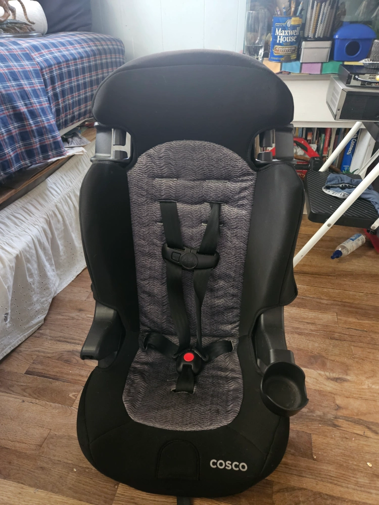 10Selling a Cosco highback booster car seat in black and gray. It's in great condition and ready for a new home! Perfect for keeping your little one safe and comfortable on the road.