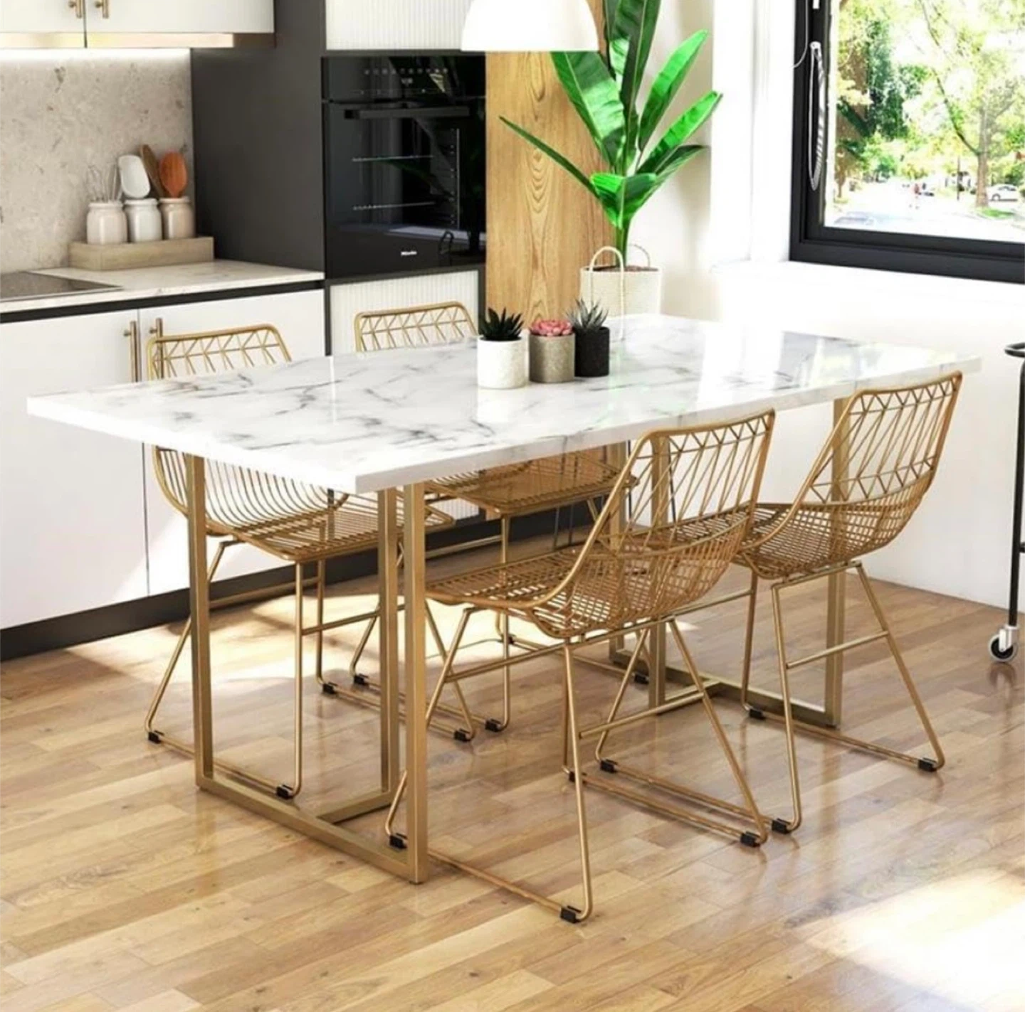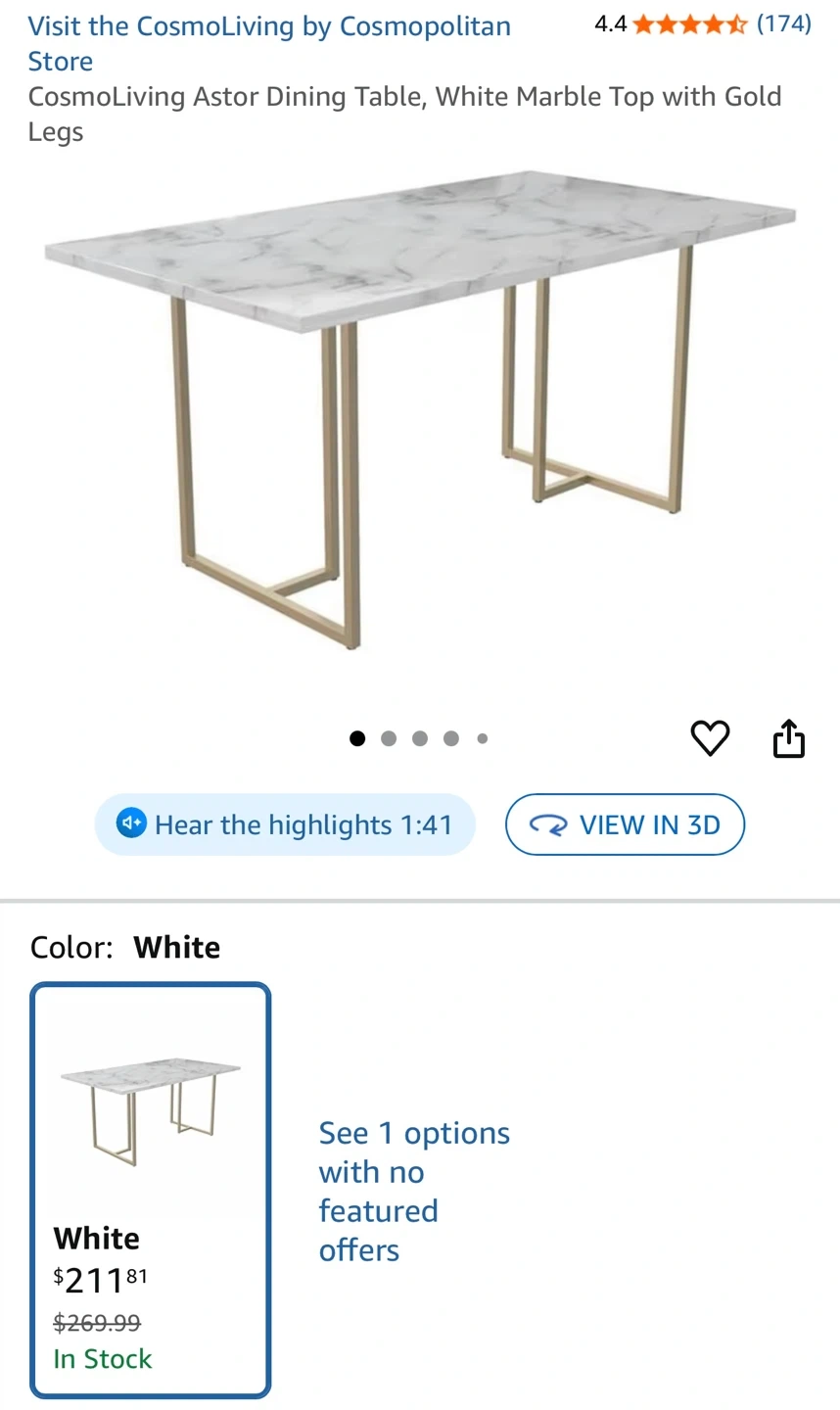 0Selling a CosmoLiving Astor dining table with a white marble top and gold legs. It's a stylish addition to any dining space! The table measures 64" x 36" x 30". Originally bought for $211.81 Amazon link: https://a.co/d/blV0U0L