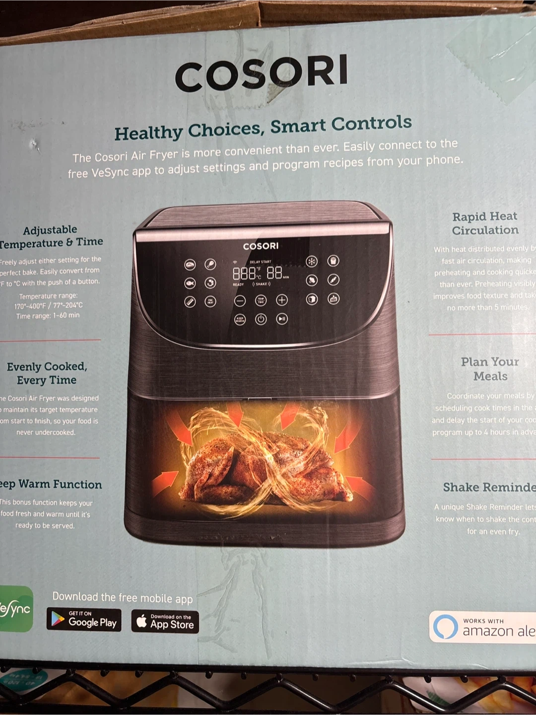 The Cosori Air Fryer makes healthy cooking a breeze! Easily connect to the free VeSync app to adjust settings and program recipes right from your phone. - Adjustable temperature & time: Freely adjust settings for the perfect bake, easily converting from °F to °C with the push of a button. Temperature range: 170°-400°F / 77-204°C. Time range: 1-60 min. - Evenly cooked every time: Designed to maintain its target temperature from start to finish, so your food is never undercooked. - Rapid heat circulation: Preheating visibly improves food texture and takes no more than 5 minutes - Shake reminder: A unique shake reminder lets you know when to shake the contents for an even fry
