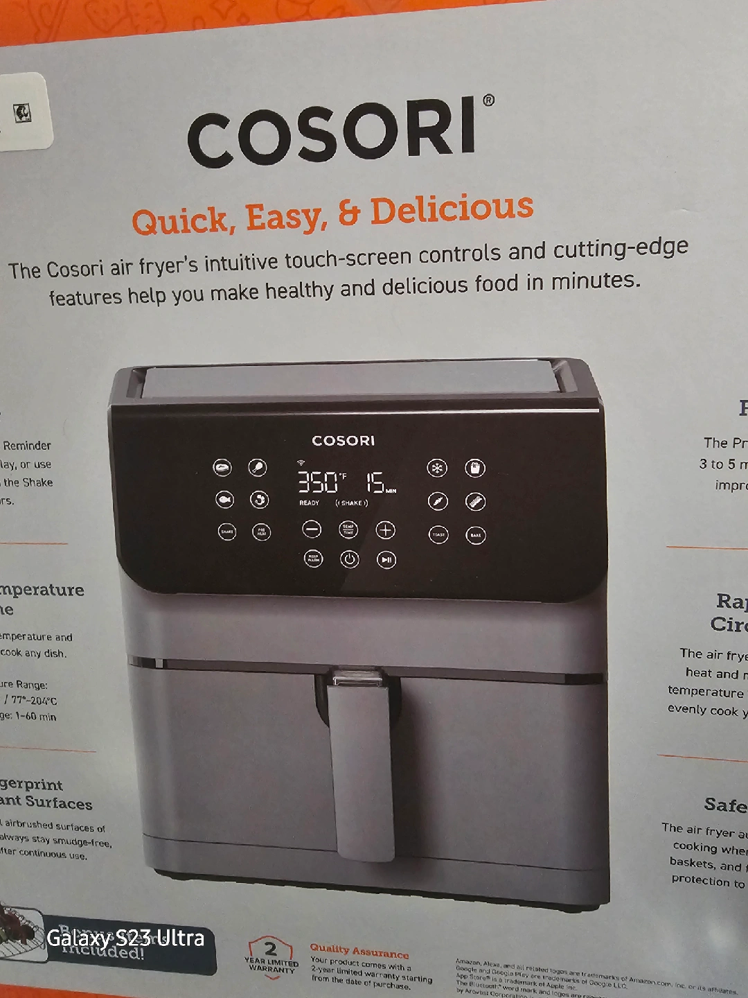 60I'm selling a COSORI air fryer that's in great condition! It features intuitive touch-screen controls and cutting-edge features to help you make healthy and delicious food in minutes. It's designed to cook smarter, not harder!