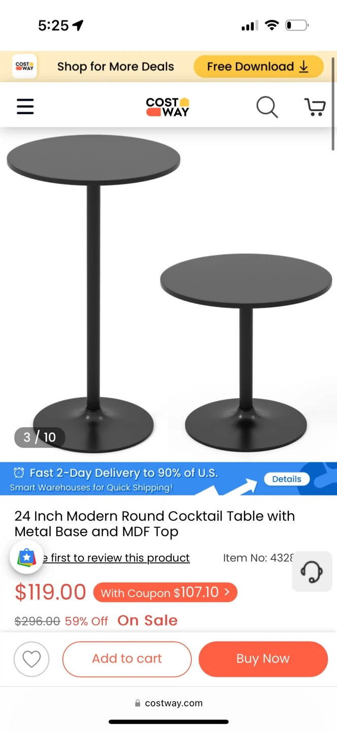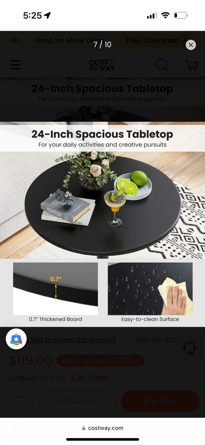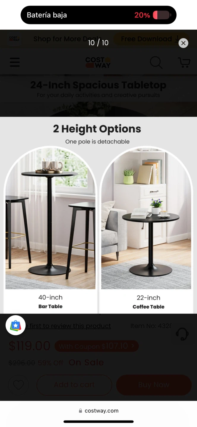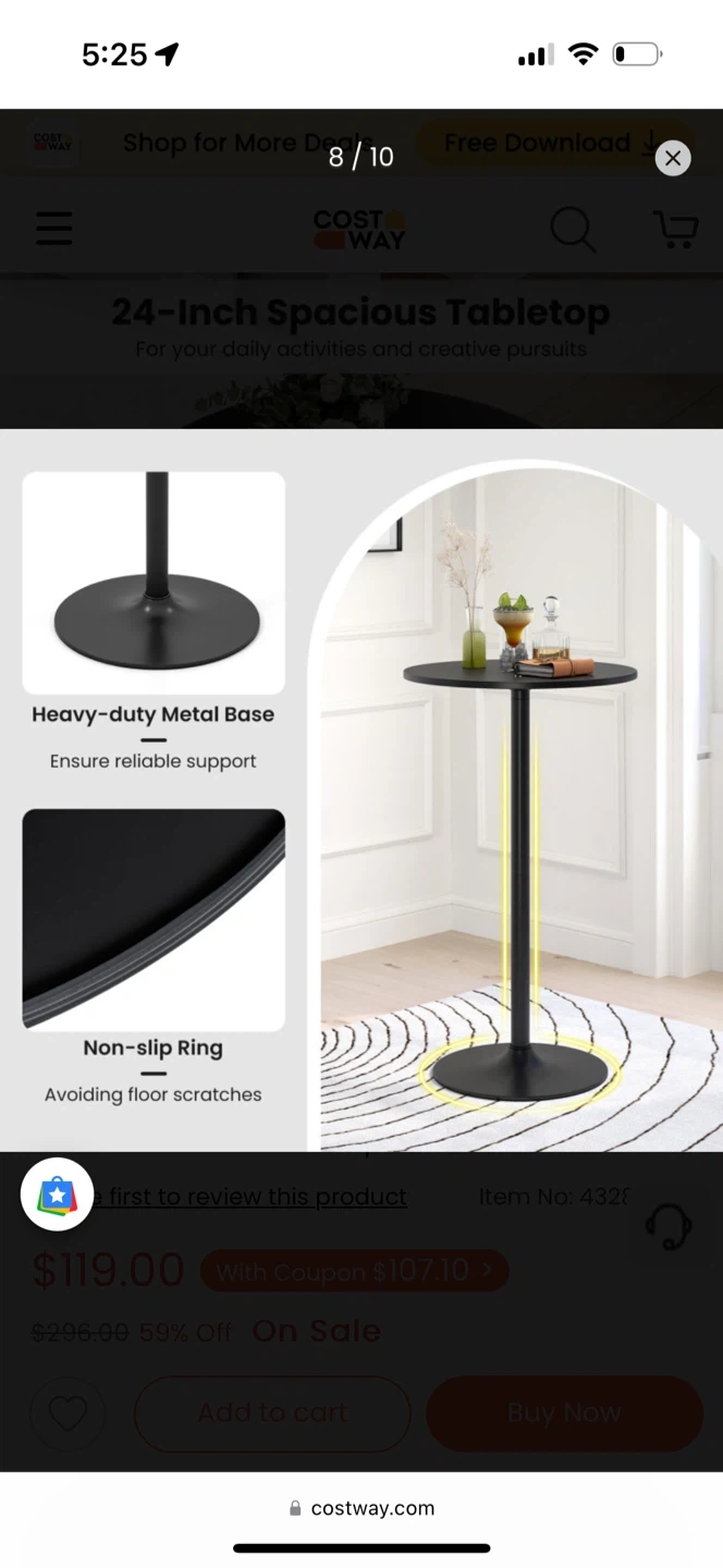 This is a COSTWAY 24-Inch Modern Round Cocktail Table with Metal Base and MDF Top. It has a heavy-duty metal base and a non-slip ring to avoid floor scratches. This table has two height options, 40-inch bar table and 22-inch coffee table. Originally bought for $119