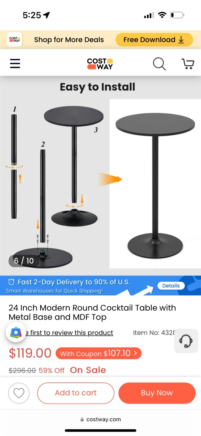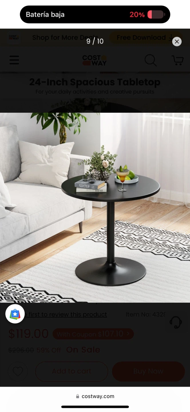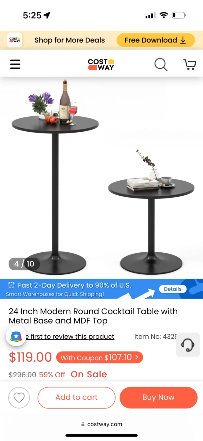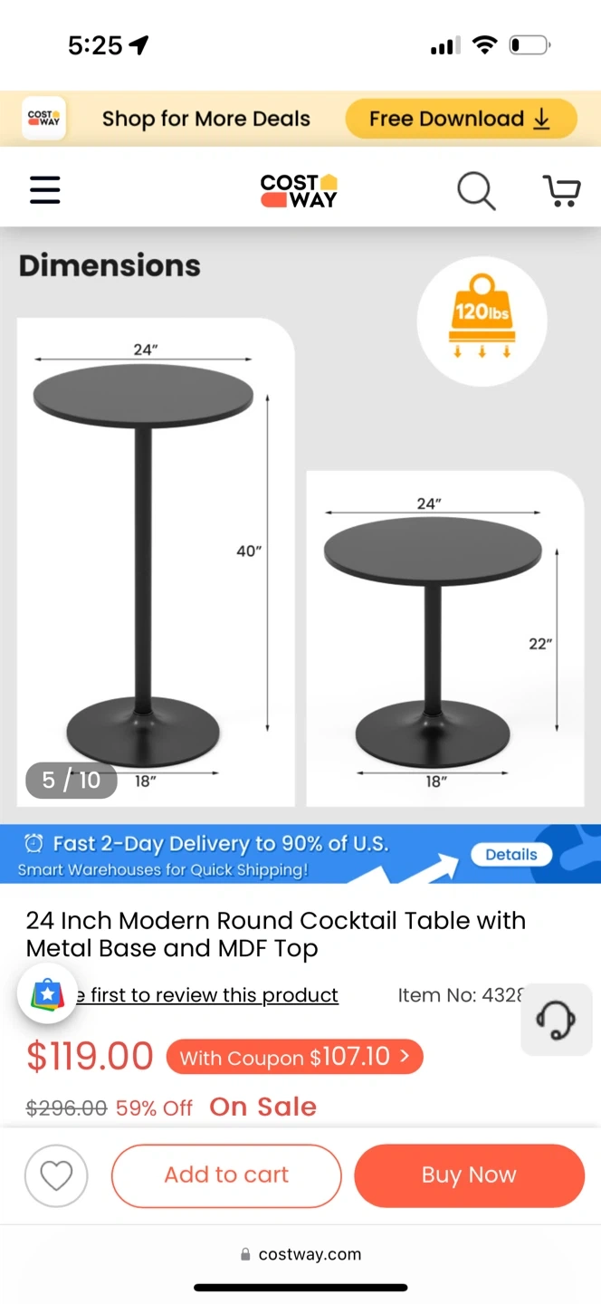 This is a COSTWAY 24-Inch Modern Round Cocktail Table with Metal Base and MDF Top. It has a heavy-duty metal base and a non-slip ring to avoid floor scratches. This table has two height options, 40-inch bar table and 22-inch coffee table. Originally bought for $119