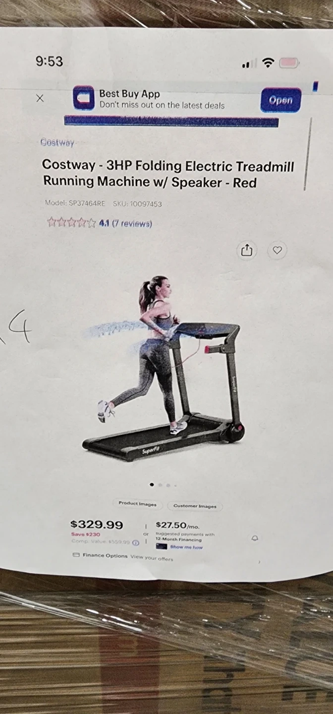 77Selling a Costway 3HP folding electric treadmill with a speaker in red! It is model number SP37464RE. I bought this for $329.99