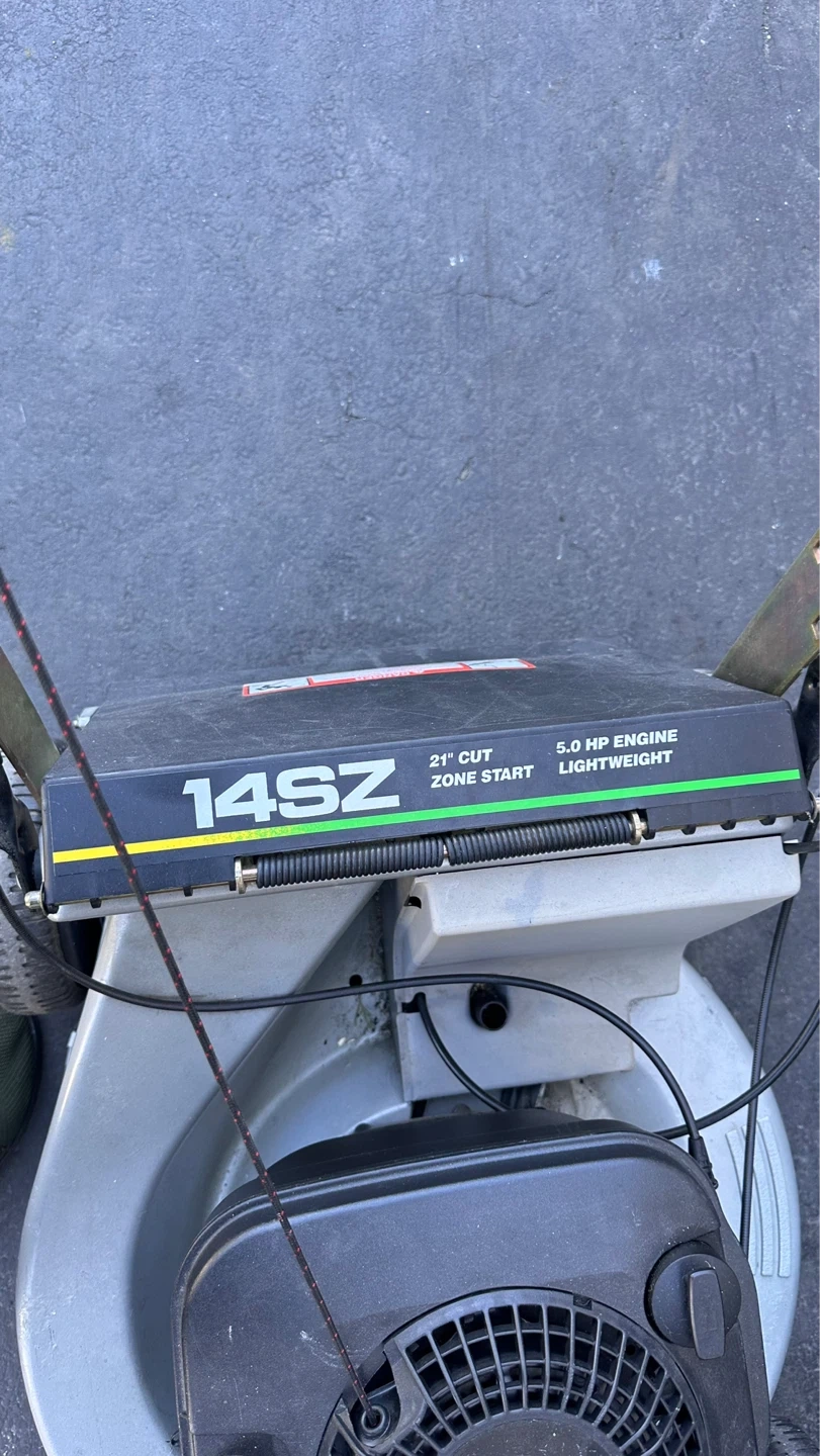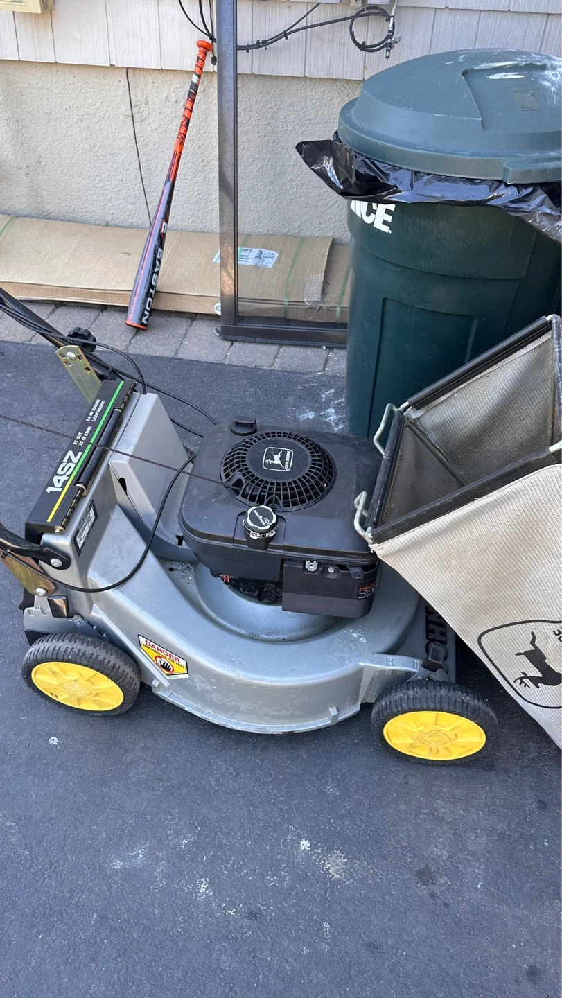 John Deere 14SZ 21 inch lawn mower. It's powered by a 5.0 HP engine with zone start. Includes a grass bagger.