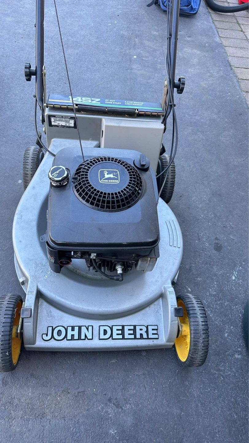 The John Deere 14SZ is a 21-inch cut, self-propelled walk-behind mower from the mid-1990s, featuring a 5.0 HP Briggs & Stratton engine, cast aluminum deck, and Zone Start system. It is often praised for its durable construction, reliable starting, and lightweight maneuverability, though it can suffer from, or be prone to, carburetor-related stalling