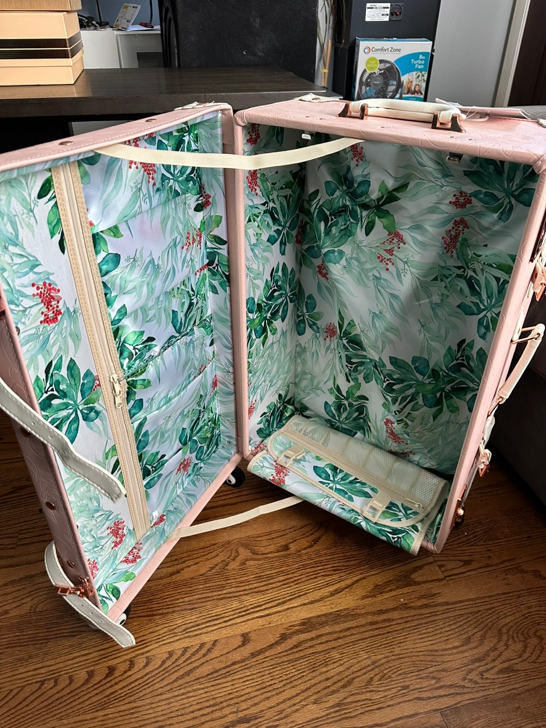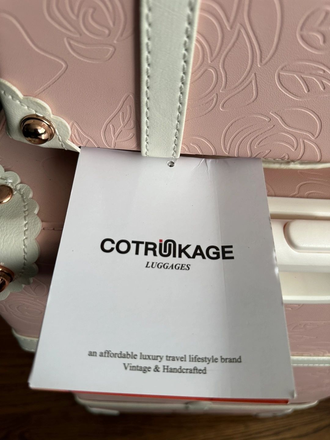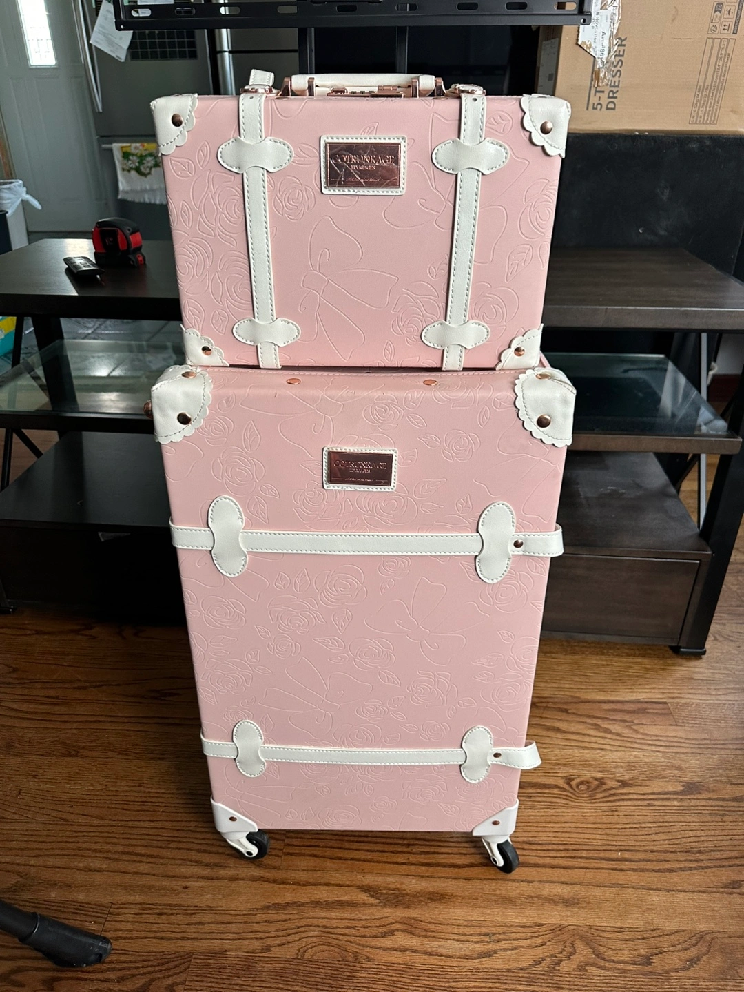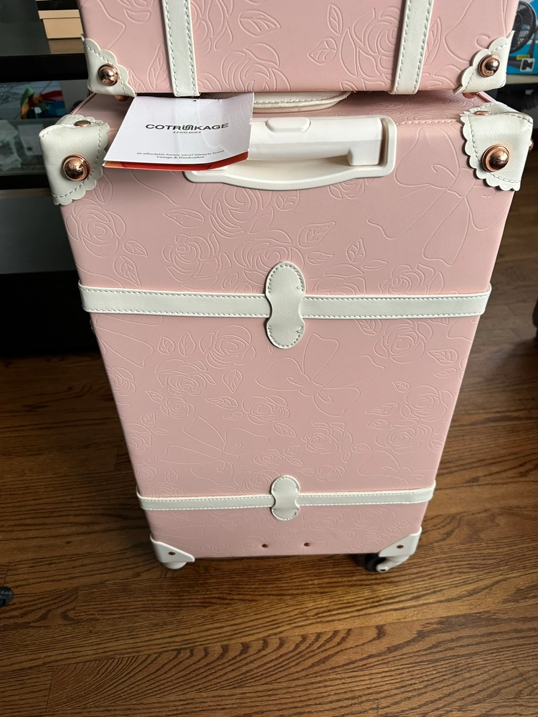 Selling a cute COTRUNKAGE luggage set in pink! It includes a larger rolling suitcase and a smaller carry-on. The set has a beautiful rose pattern and white trim, giving it a vintage and handcrafted feel. Perfect for your next trip!