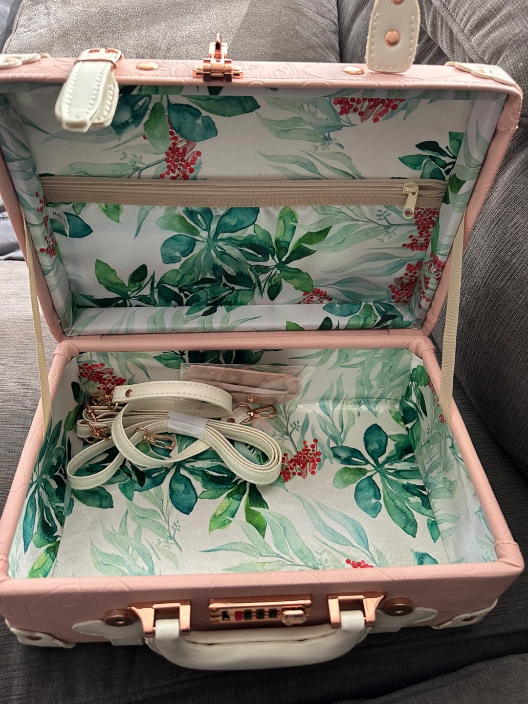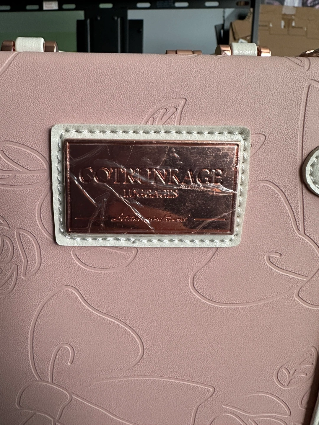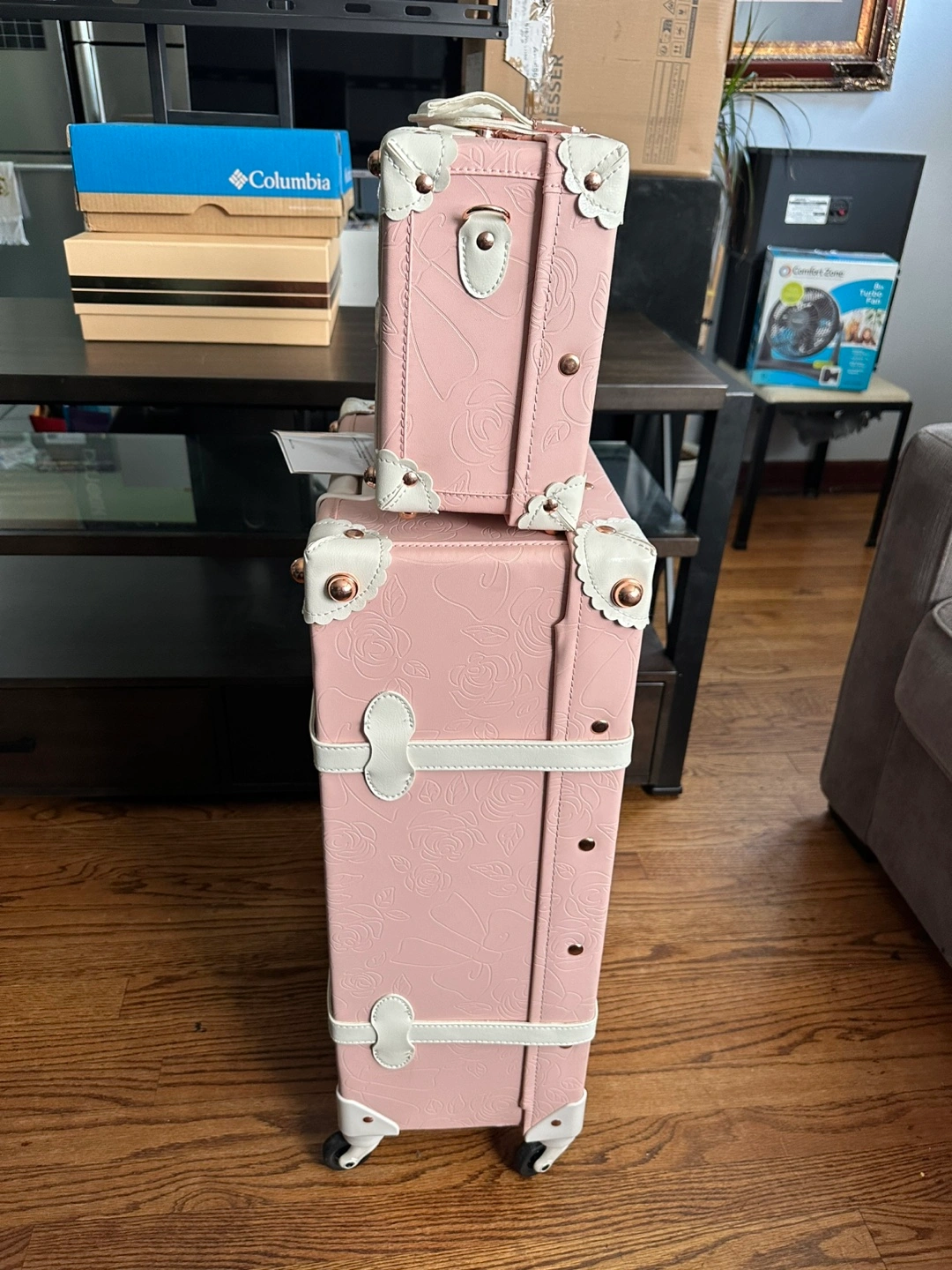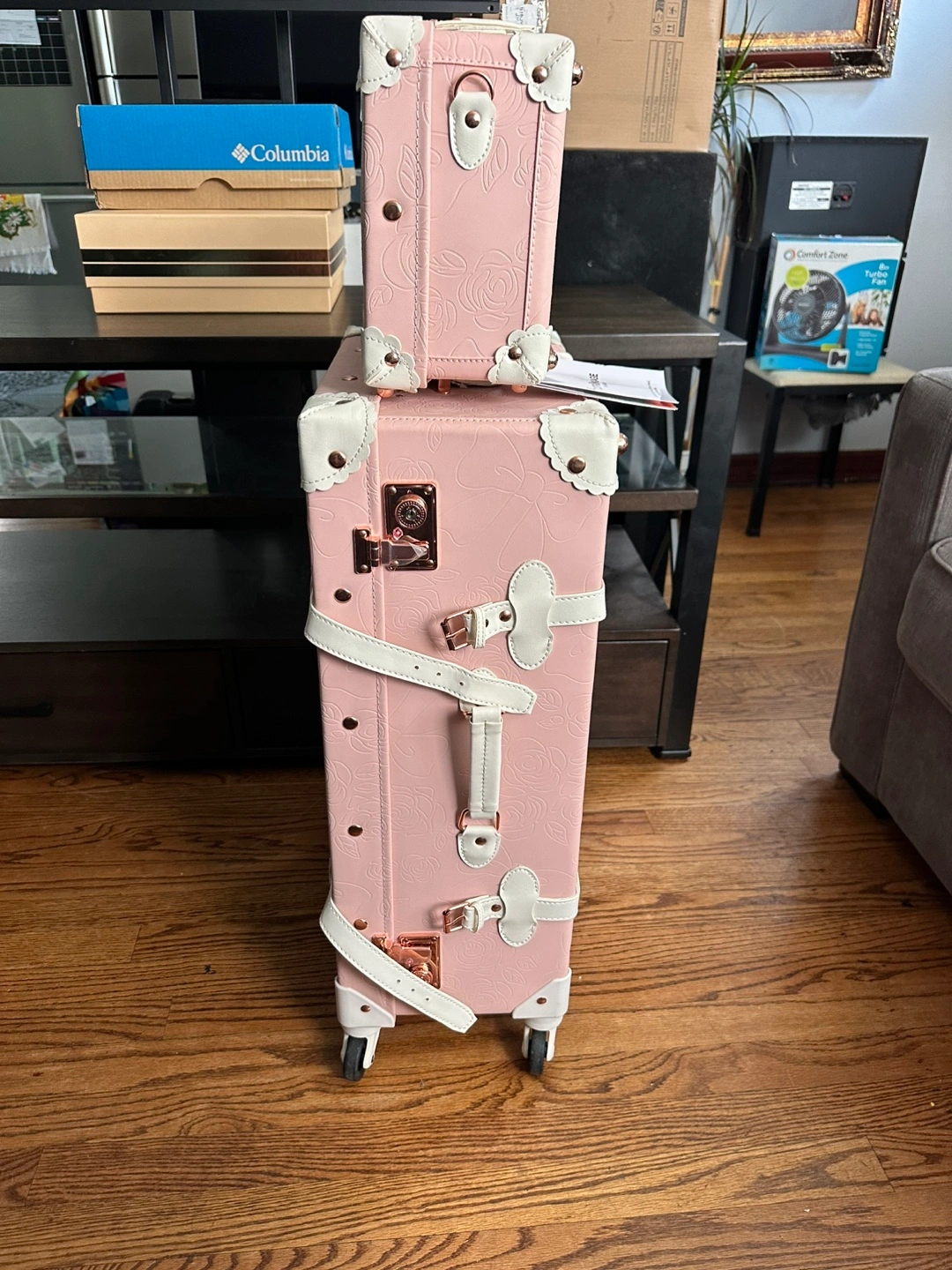 Selling a cute COTRUNKAGE luggage set in pink! It includes a larger rolling suitcase and a smaller carry-on. The set has a beautiful rose pattern and white trim, giving it a vintage and handcrafted feel. Perfect for your next trip!