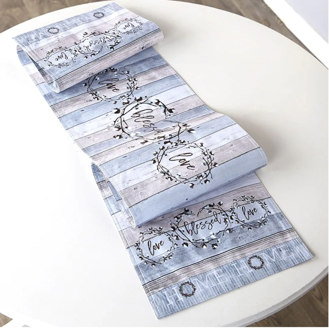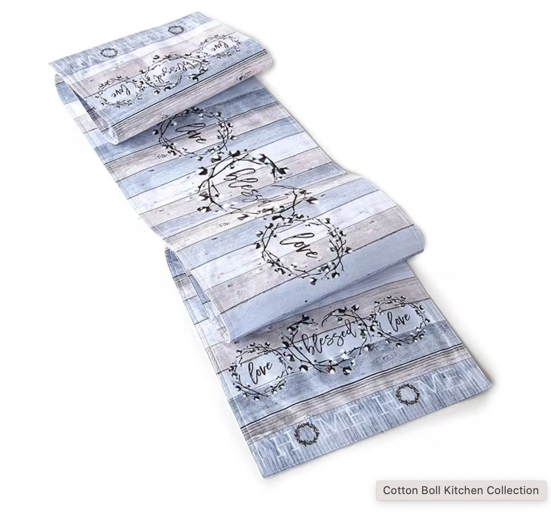 15Cotton Boll - Table Runner Color-Gray Wood Pallet Distressed Design Give your home a farmhouse touch with this Cotton Boll Kitchen Collection. Each piece features the cotton boll wreath design with the words "Blessed", "Home" and "Love" on the shiplap background. Table Runner 14"W x 72"L Polyester Machine care Imported