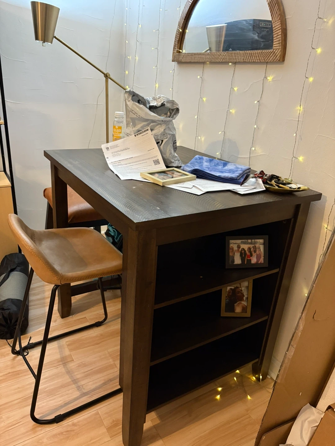 10I'm selling a counter height dining table with built-in shelves! It's perfect for smaller spaces and adds a touch of rustic charm to any kitchen or dining area. The table features a dark wood finish and is in good condition. The shelves provide extra storage for dishes, cookbooks, or decor