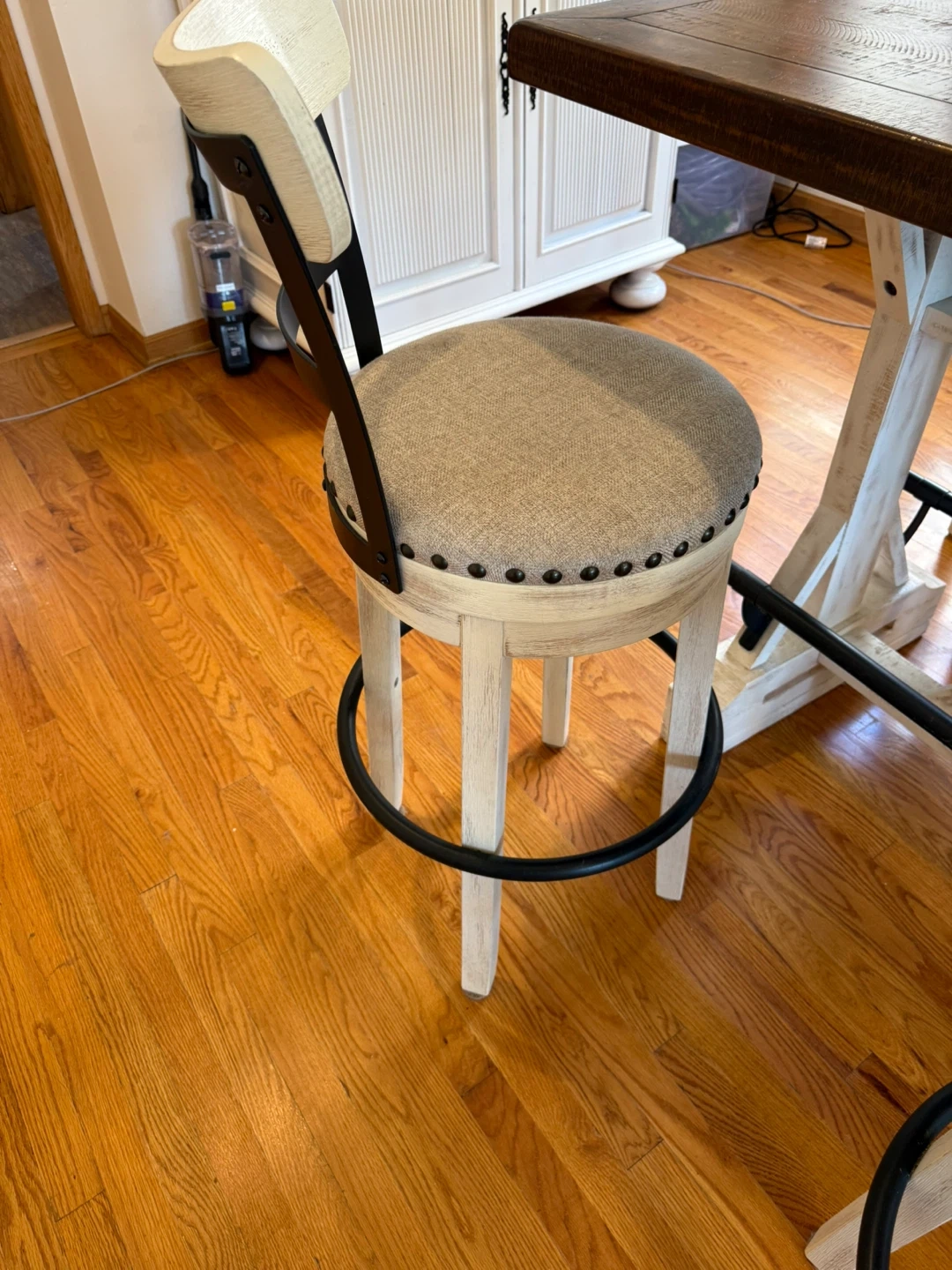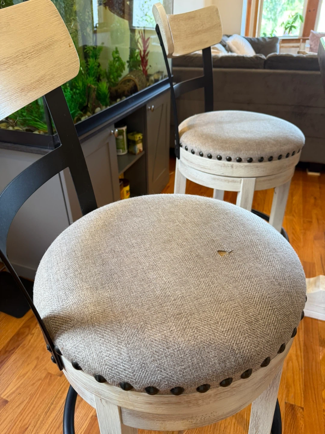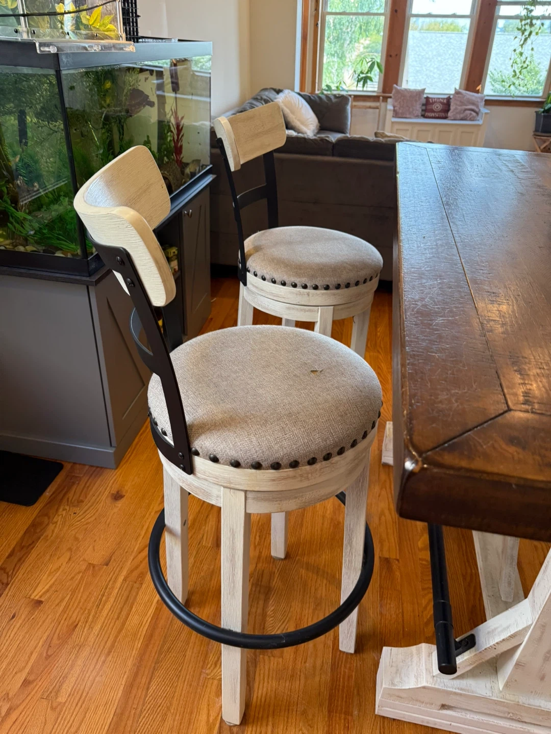 Selling a set of four counter height swivel stools. They have a neutral-colored fabric seat with nailhead trim and a distressed white wood finish. Perfect for a kitchen island or bar area! Pls see last pic barstool lil damage. But can be fixed
