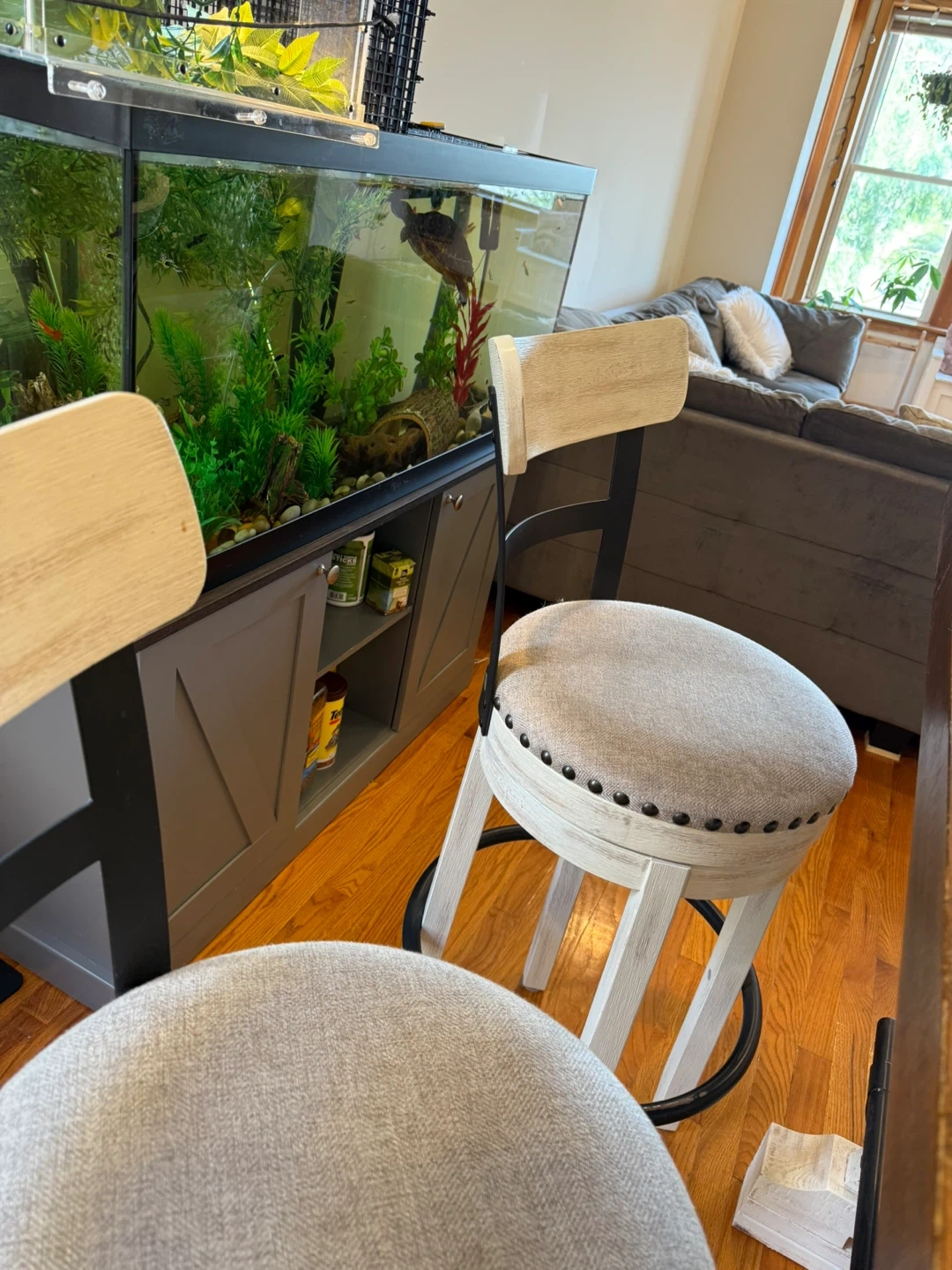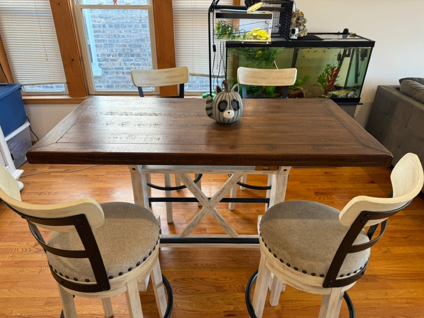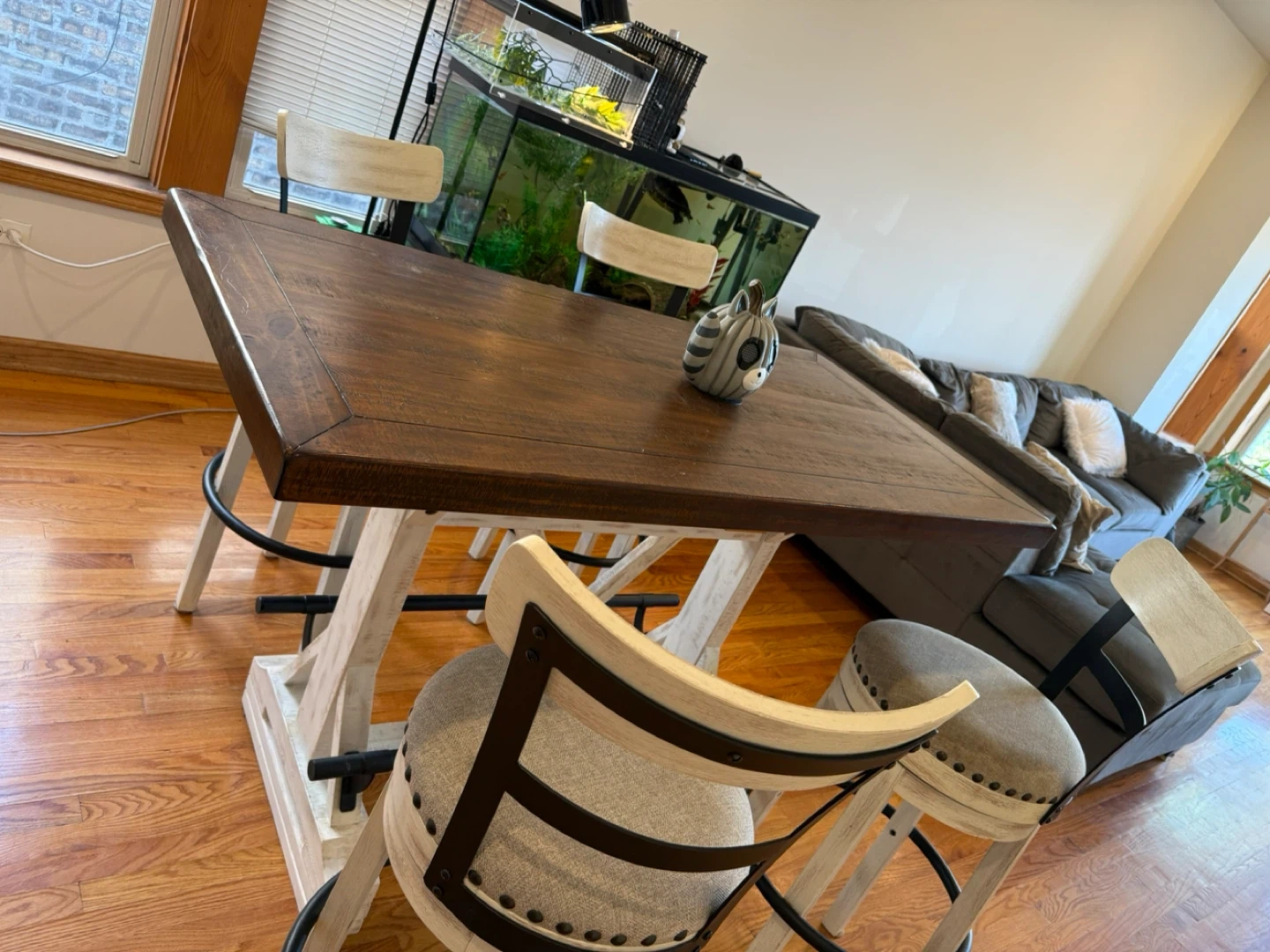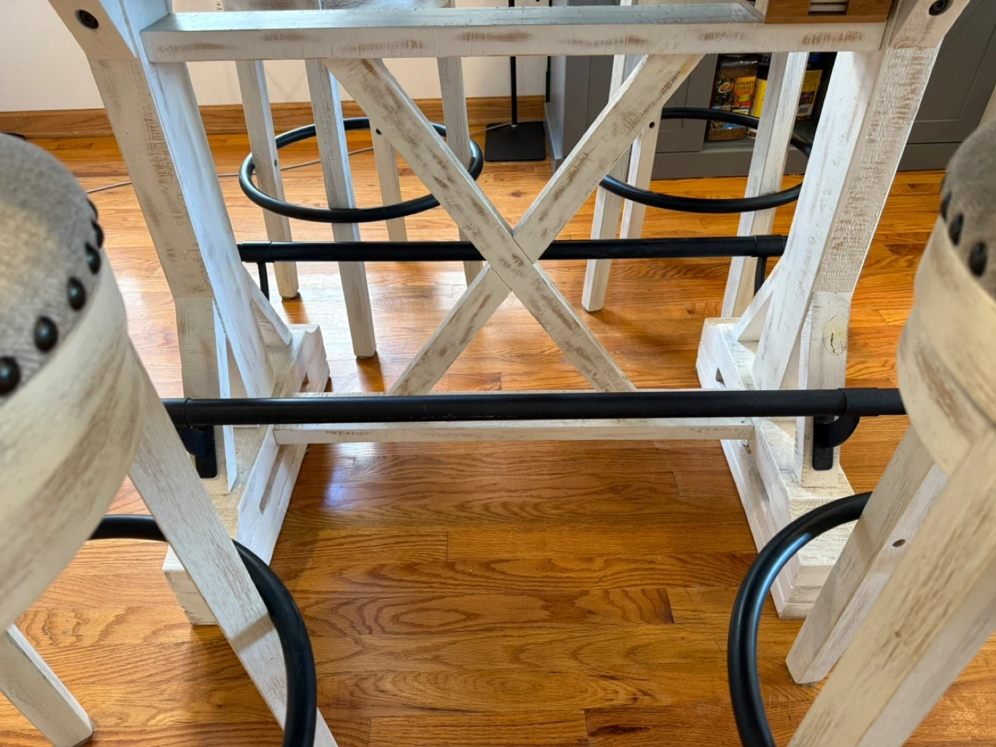 Selling a set of four counter height swivel stools. They have a neutral-colored fabric seat with nailhead trim and a distressed white wood finish. Perfect for a kitchen island or bar area! Pls see last pic barstool lil damage. But can be fixed