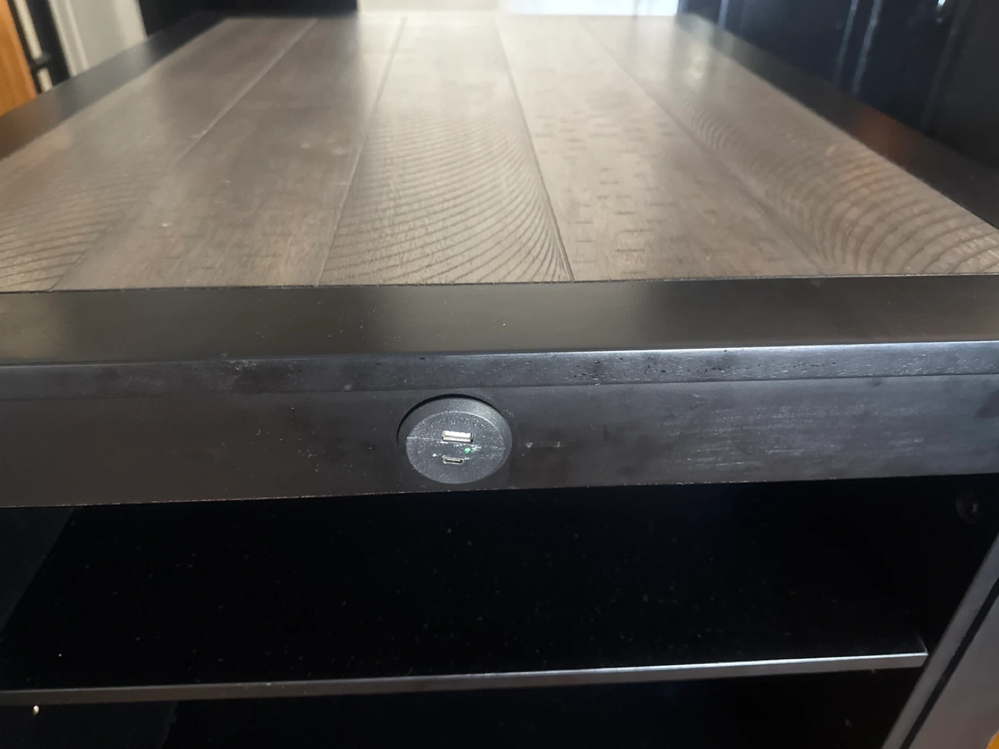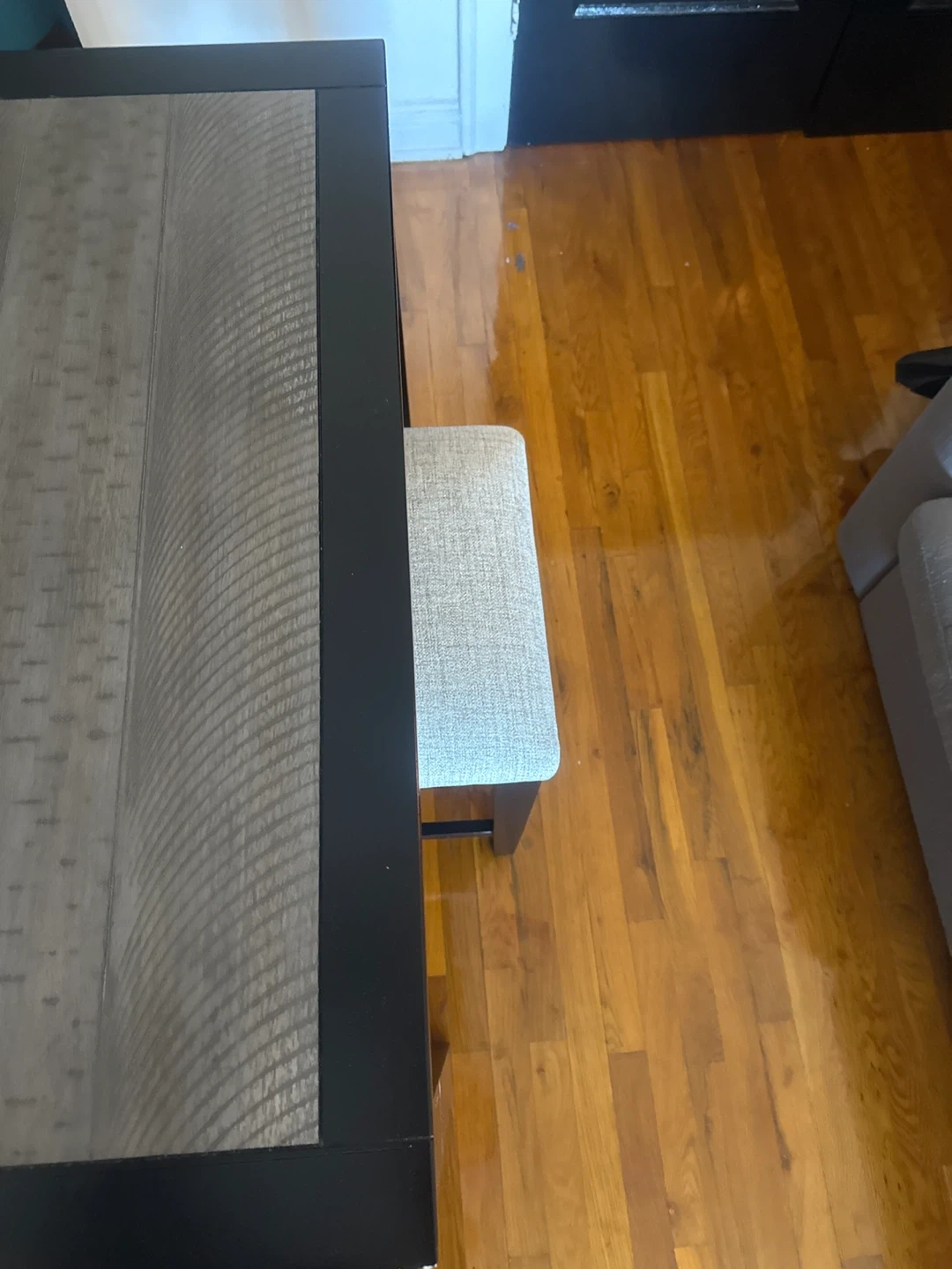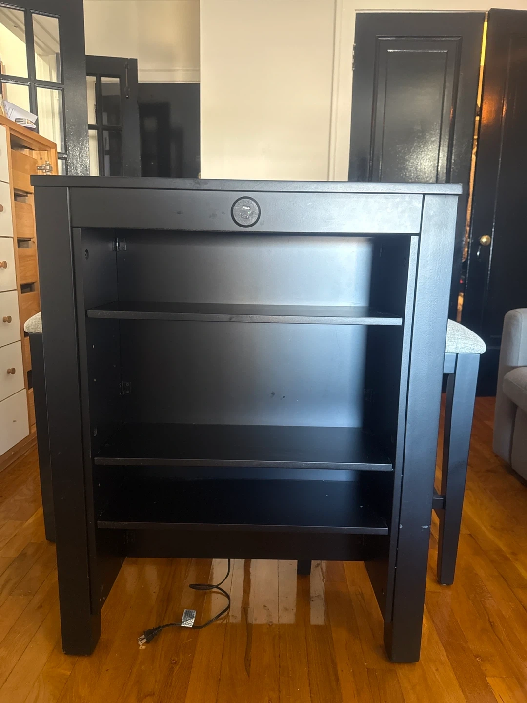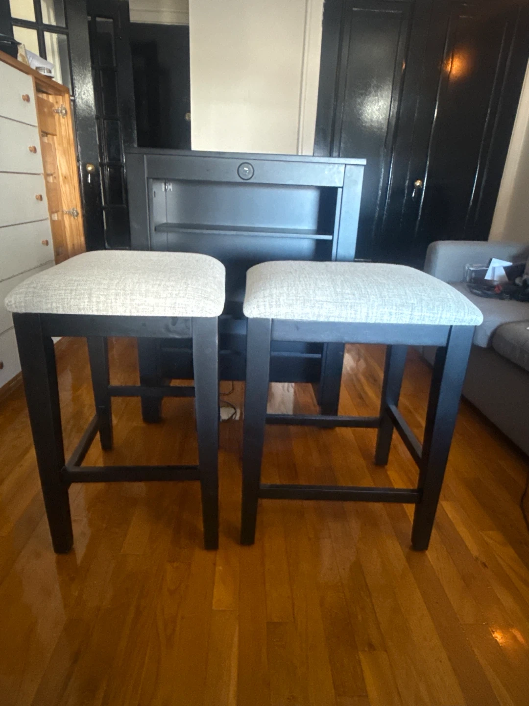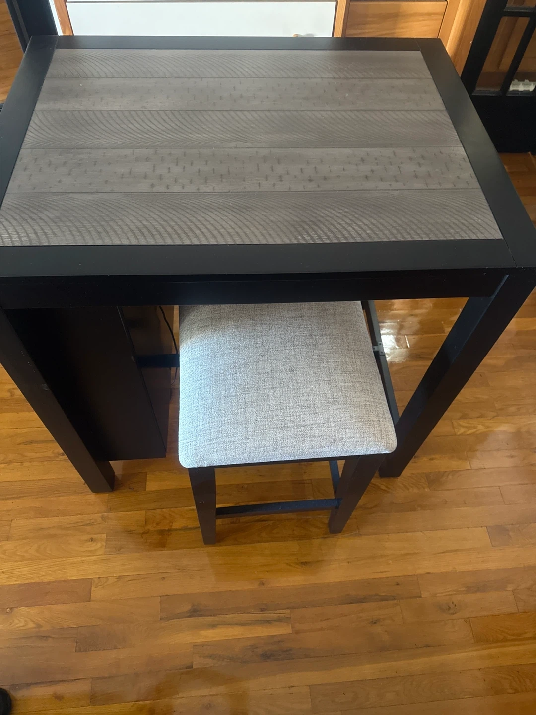 60Selling a counter height table with two stools. The table is black and has a wooden top. It also has a built-in USB port! The stools have light gray cushioned seats and are in great condition