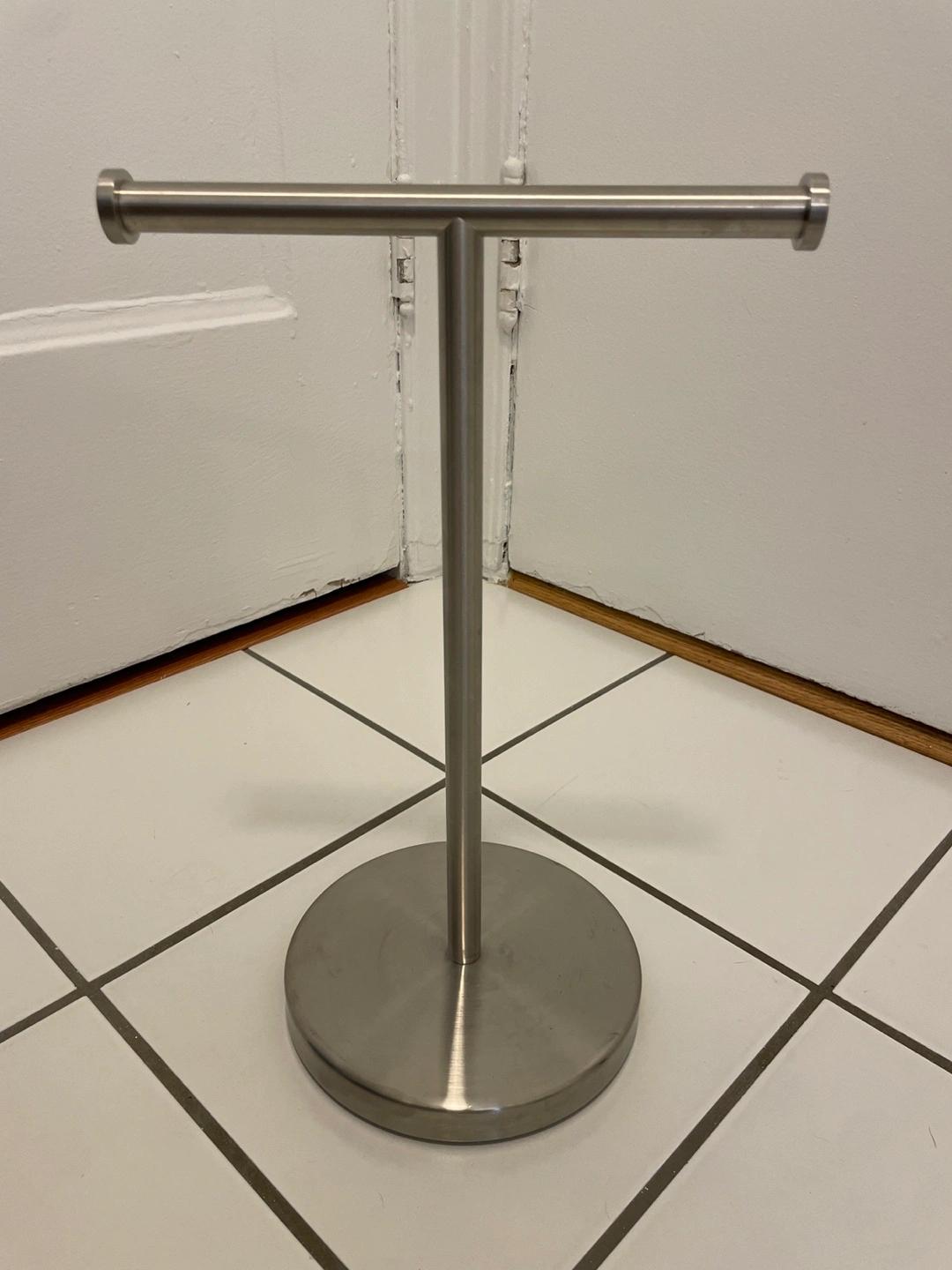 15217 inches tall. 8 inches wide. Stainless steel. Good for bathrooms with plenty of counter space where you don’t have a towel bar on the wall.