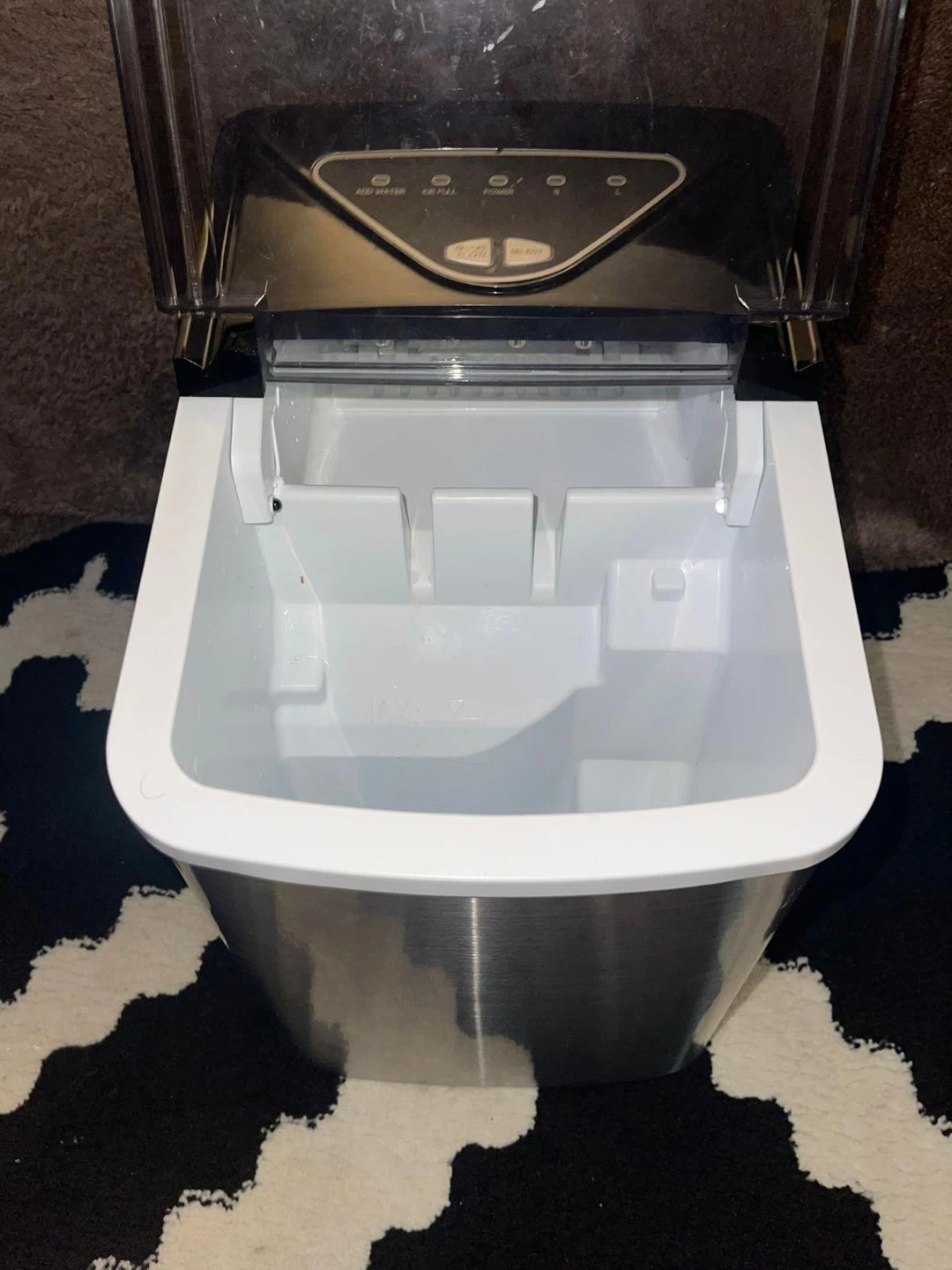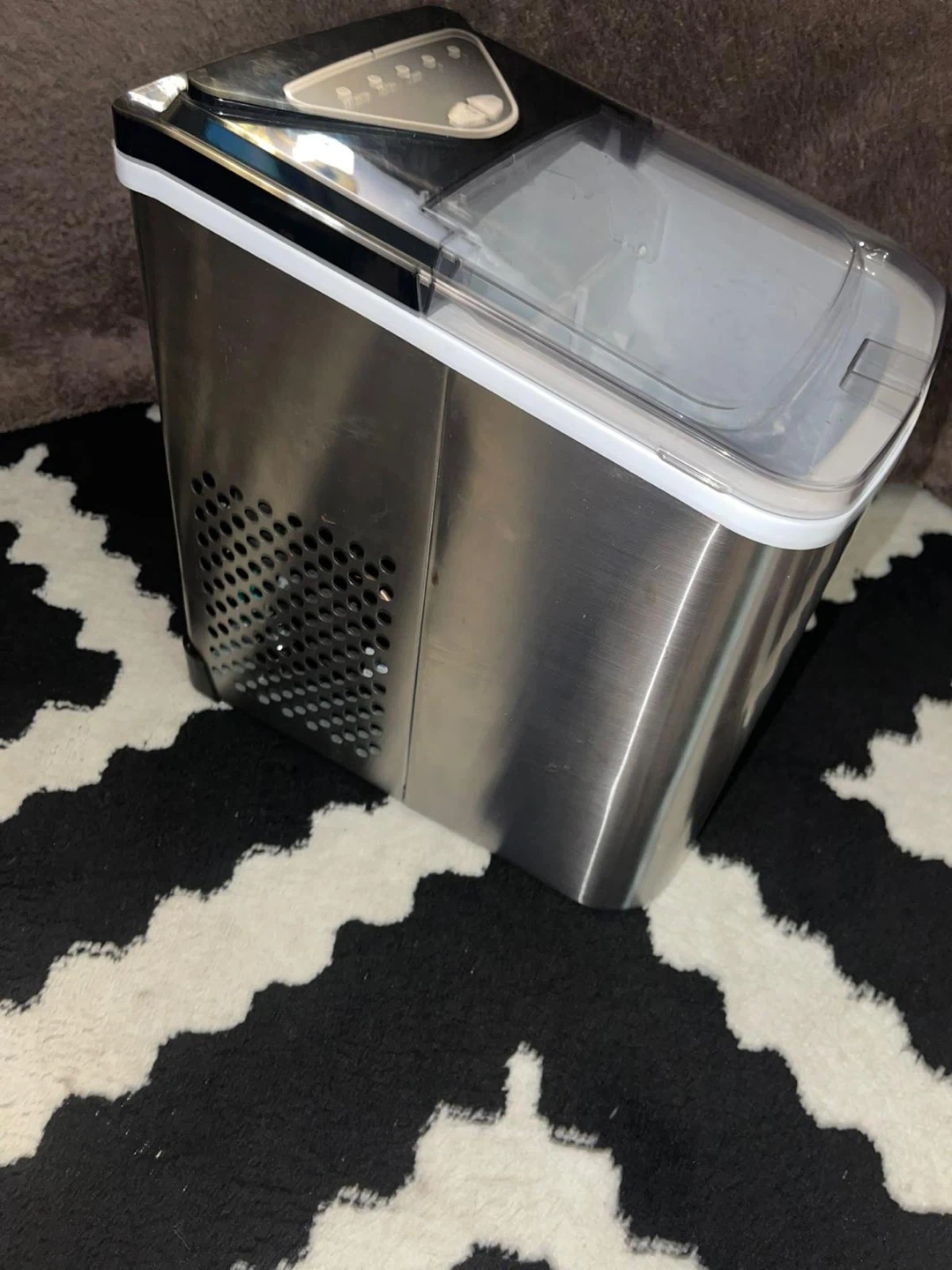 Selling a countertop ice maker in great condition. It features a stainless steel finish and a black top with indicator lights. Perfect for making ice quickly and easily!