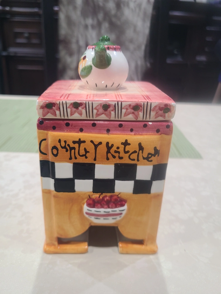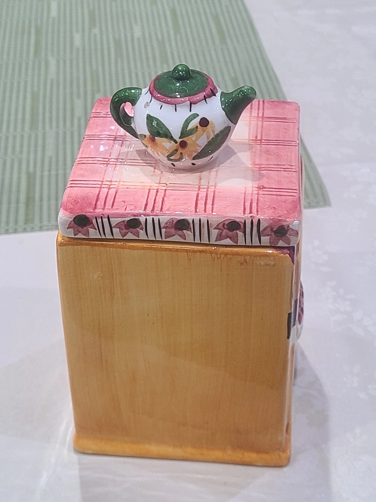 Here's a cute ceramic canister for your kitchen! It has a fun Country Kitchen design with a teapot on the lid and a cheerful color scheme. Holds up to 20 tea bags.