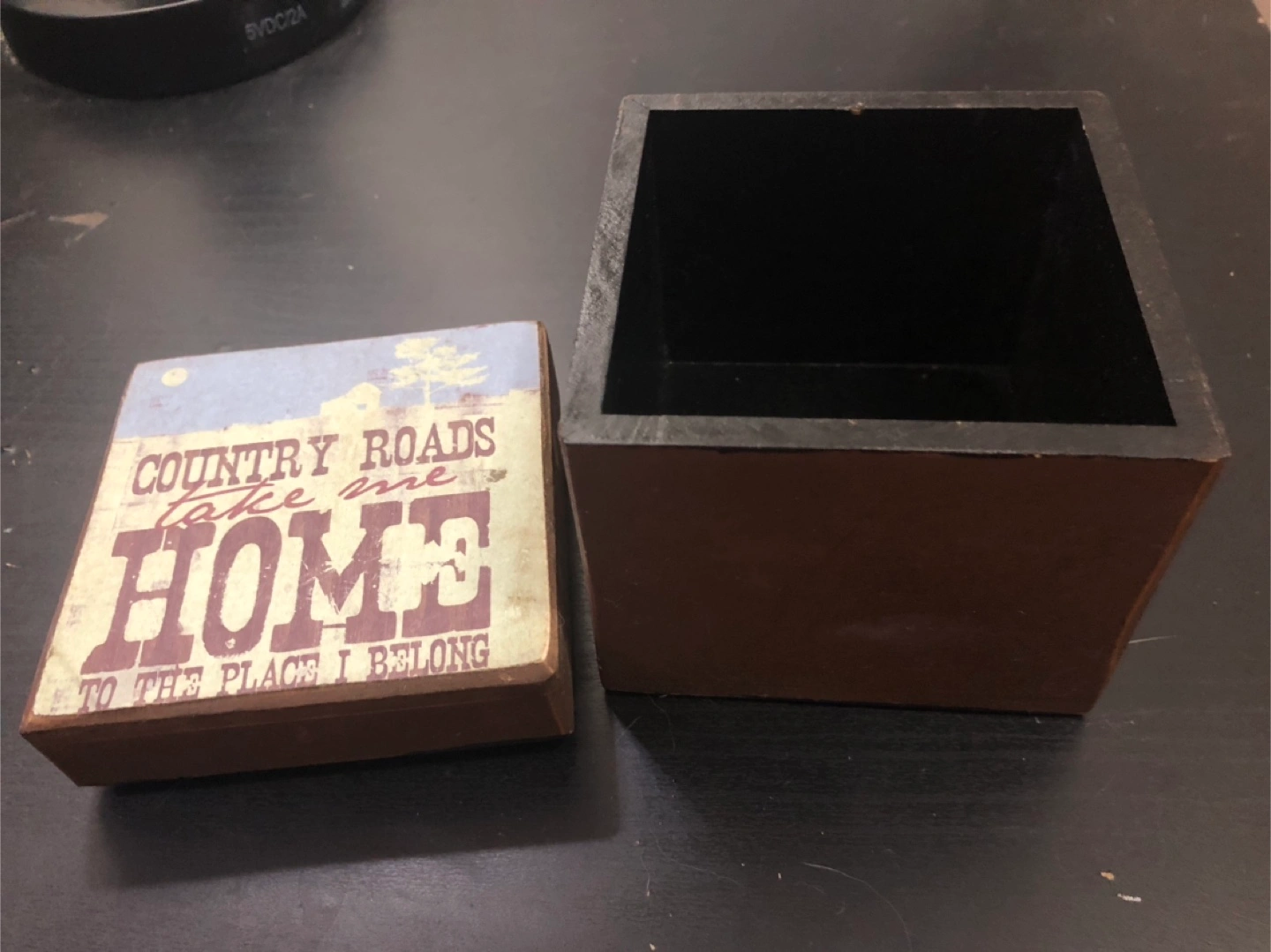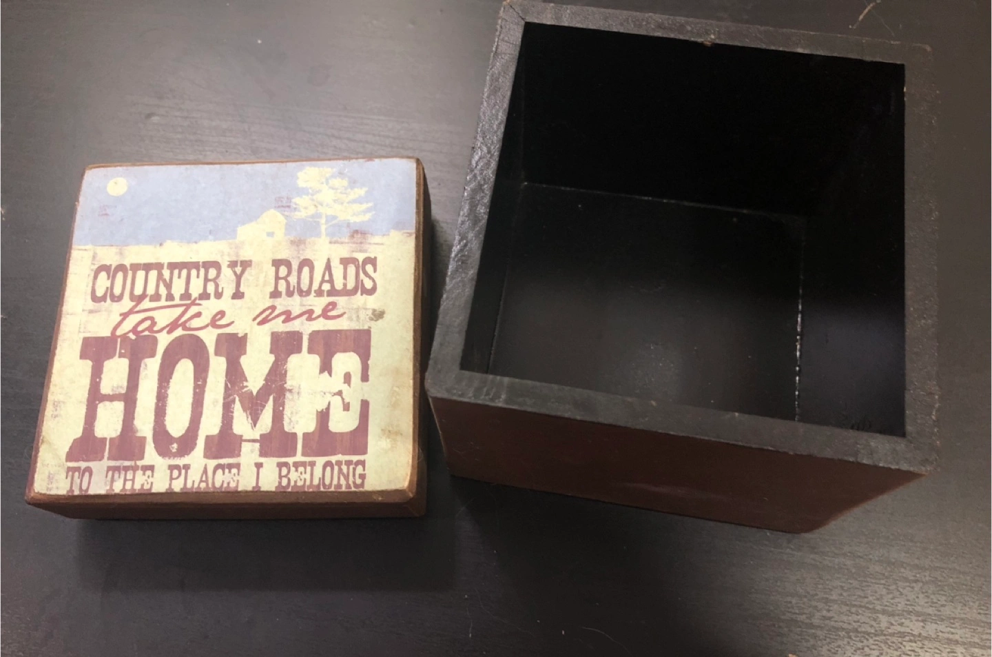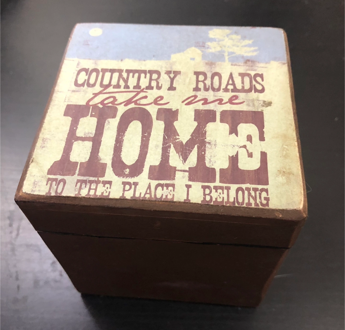 Wooden box with 'Country Roads Take Me Home' design