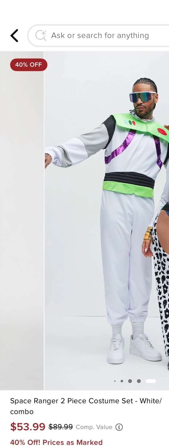 Get ready to blast off with this Space Ranger 2 Piece Costume Set in white! This costume is perfect for any Toy Story fan looking to dress up as their favorite space ranger. Men’s size: M/L Woman’s woody costume size: L Both brand new never worn only tried on