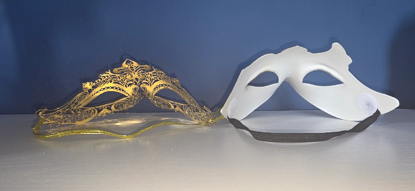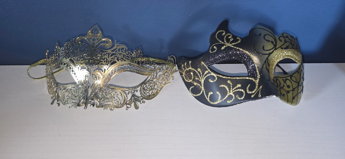 103Selling a couple of masquerade masks! One is a gold filigree style, and the other is black and gold. Both have elastic straps to stay on your face. They're in great condition and ready for your next party or event Really comfortable to use. No slipped worries