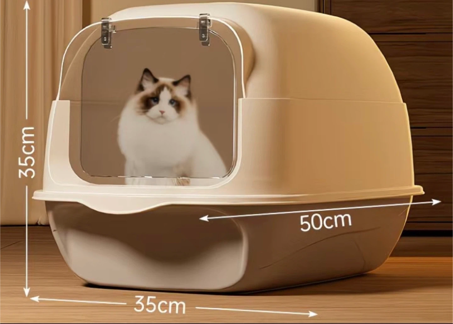 Selling a covered cat litter box! It measures approximately 35cm in height, 50cm in length, and 35cm in width. It's in great condition and ready for a new home for your feline friend
