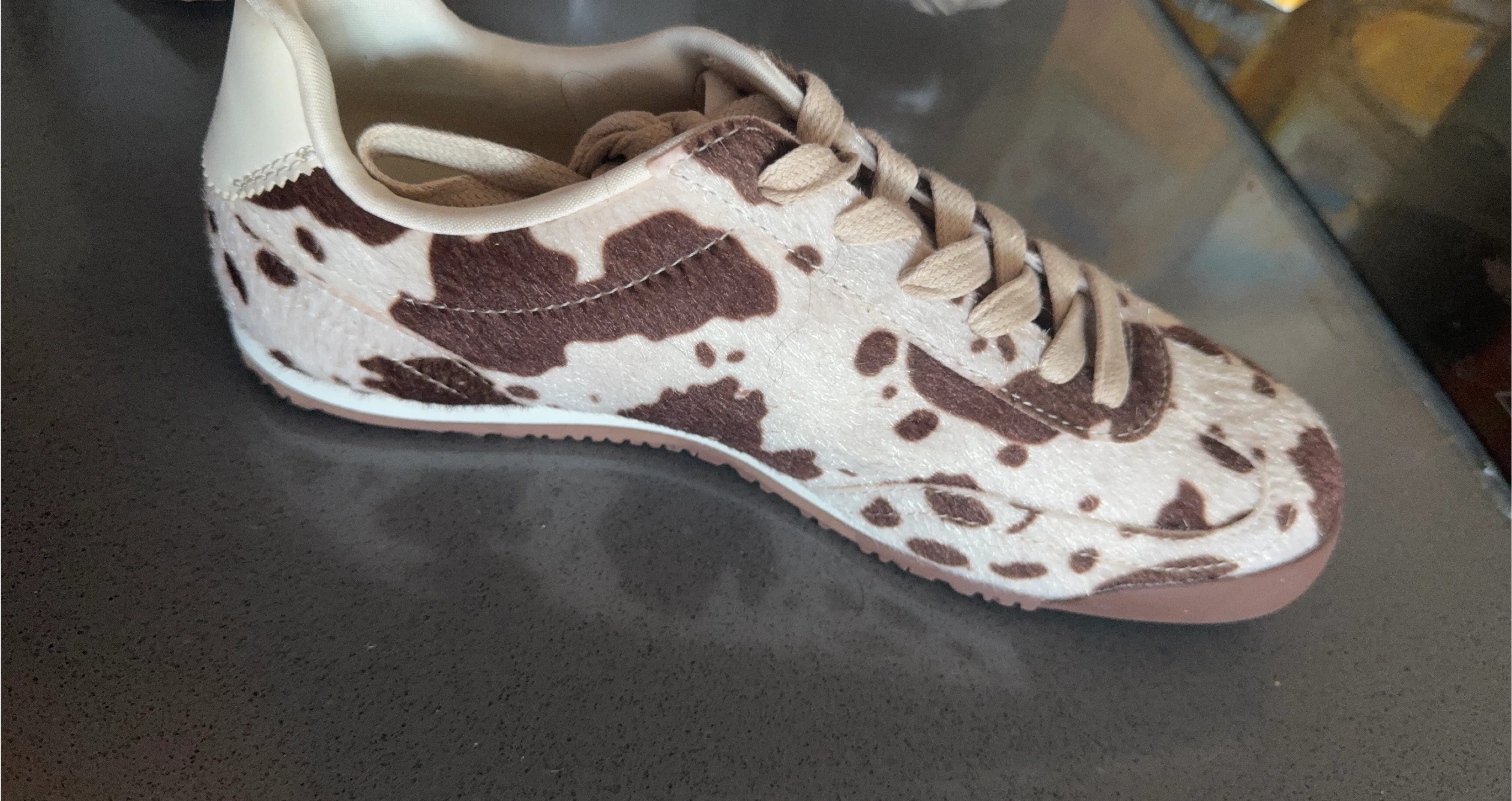 10Selling a pair of cow print sneakers. They're super unique and in great condition!