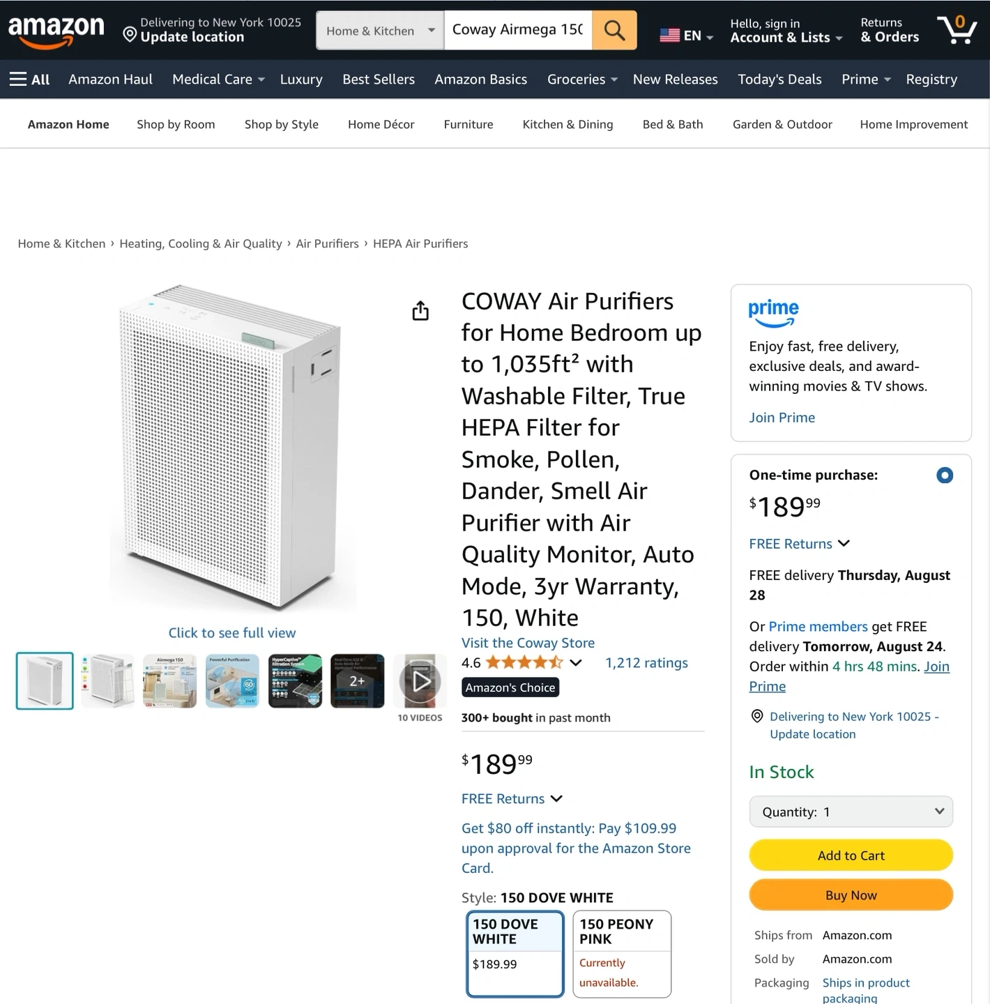 Selling a Coway Airmega 150 air purifier in white! It's designed for bedrooms up to 1,035 sq ft and features a washable filter and true HEPA filter. It also has an air quality monitor and auto mode. Originally bought for $189.99