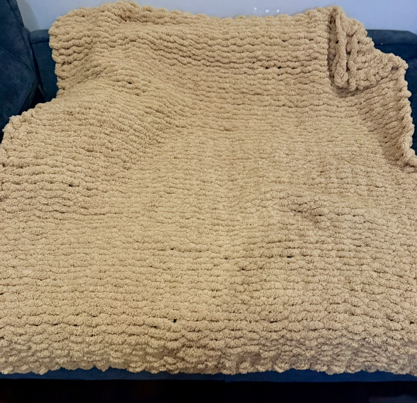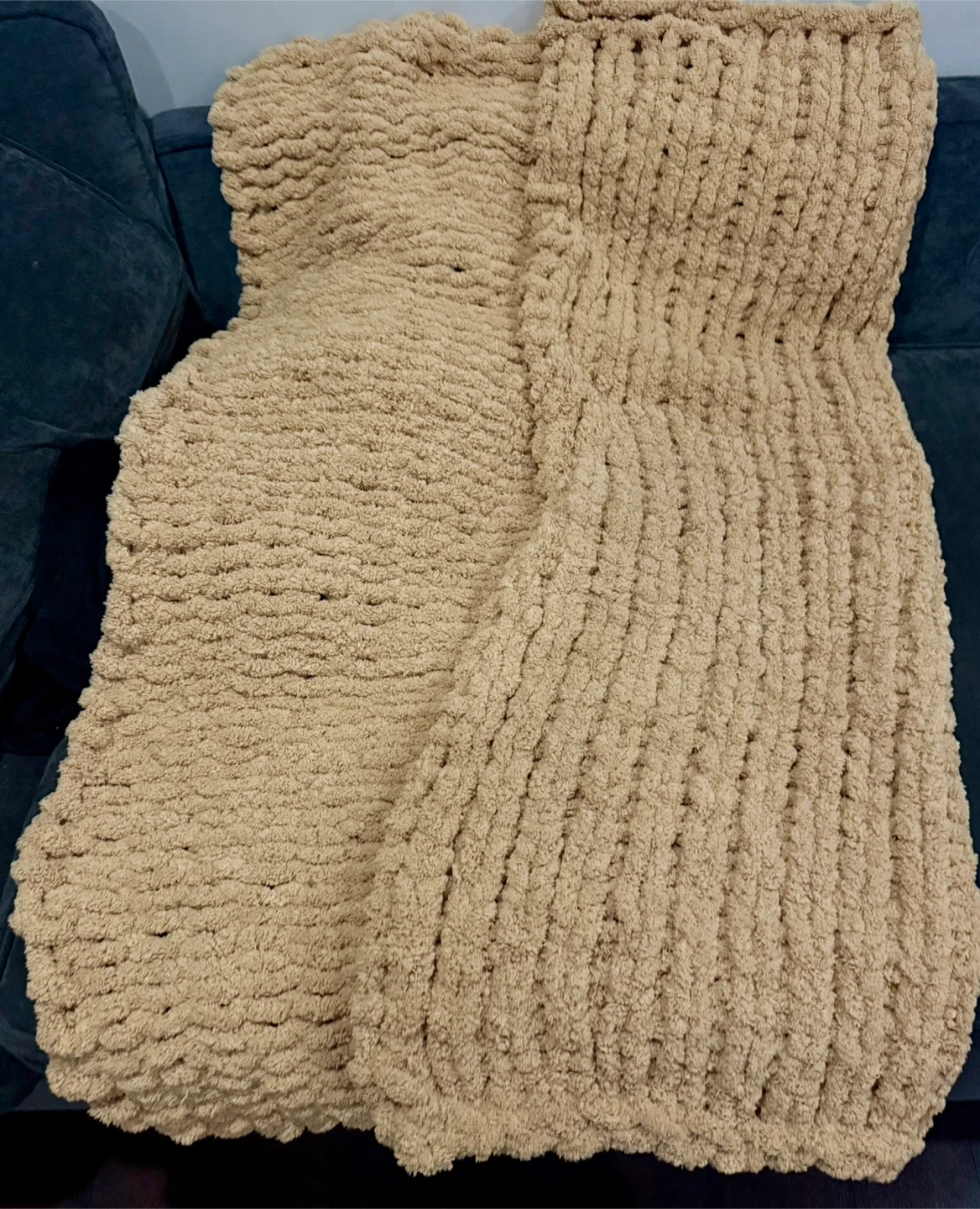 Snuggle up with this super soft, chunky knit blanket! It's a beautiful beige color and has a lovely texture. Perfect for adding a touch of warmth and style to your home.