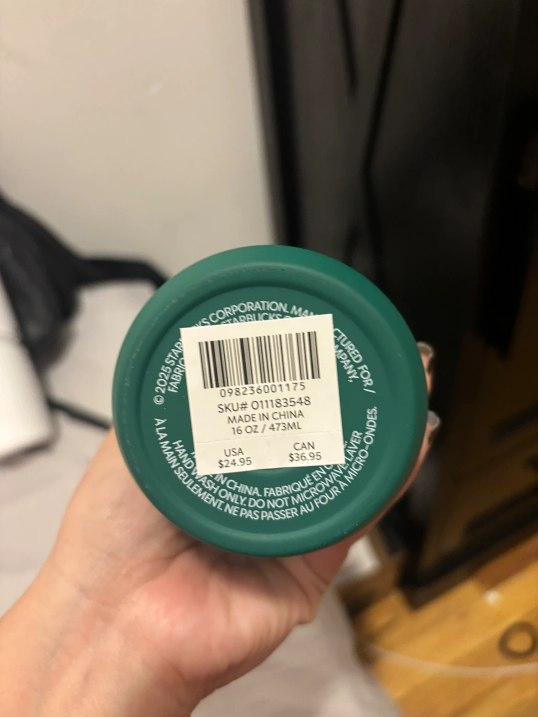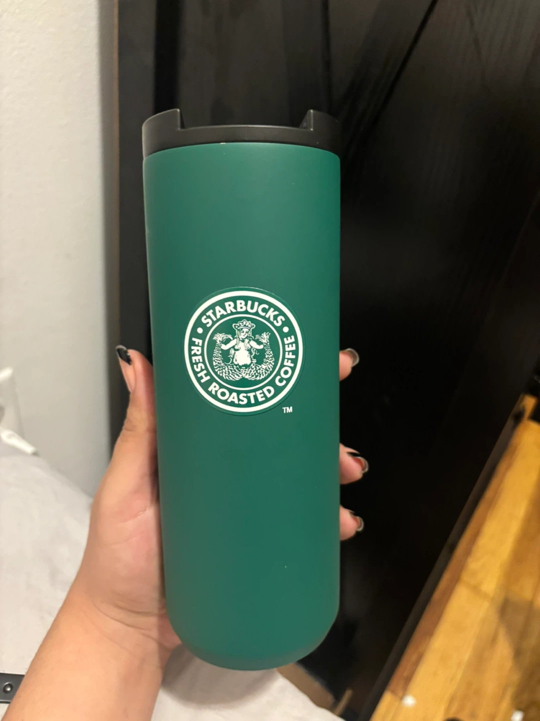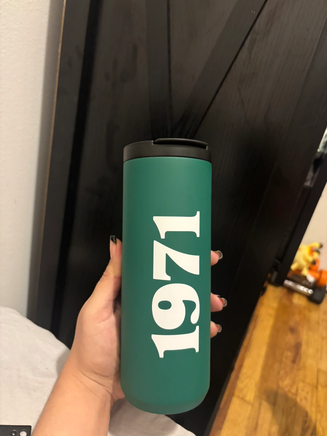 Green Starbucks tumbler with "1971" printed on it. Holds 16 oz or 473 ml. Hand wash only, do not microwave.