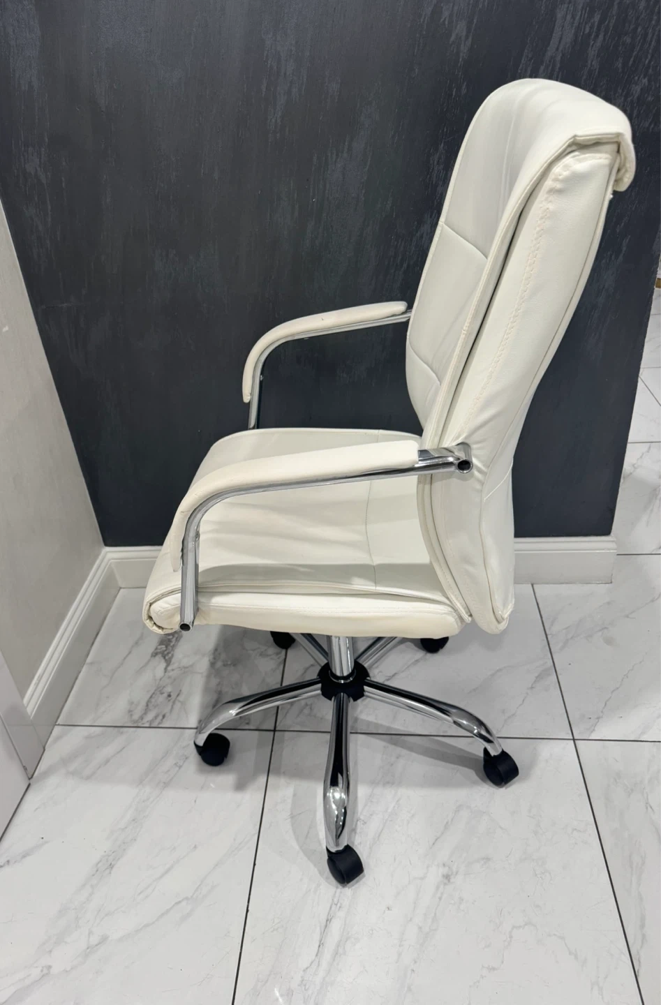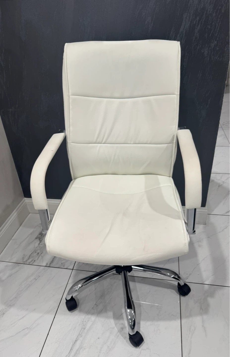 Here's a comfortable white leather office chair, perfect for your home or office space! It has a classic design and is in great condition. The chair features a sturdy base and smooth-rolling casters for easy movement. It will add a touch of elegance to any room