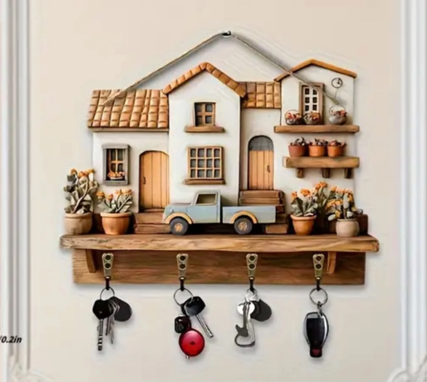 Adorable key holder. Features a charming house design. Wooden construction. Multiple hooks for keys. Perfect for entryway organization. New, never used.