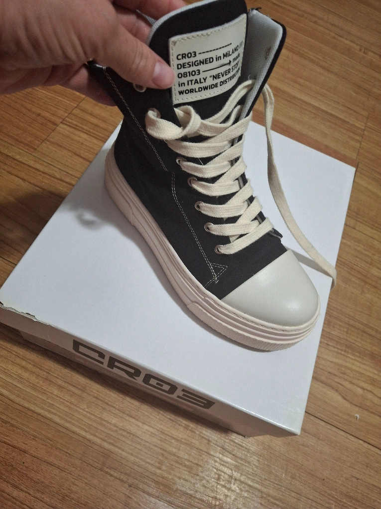 15Selling a pair of CR03 high top sneakers in black. They come with the original box. These sneakers have a classic design, perfect for casual wear. The high-top style offers great ankle support and a stylish look