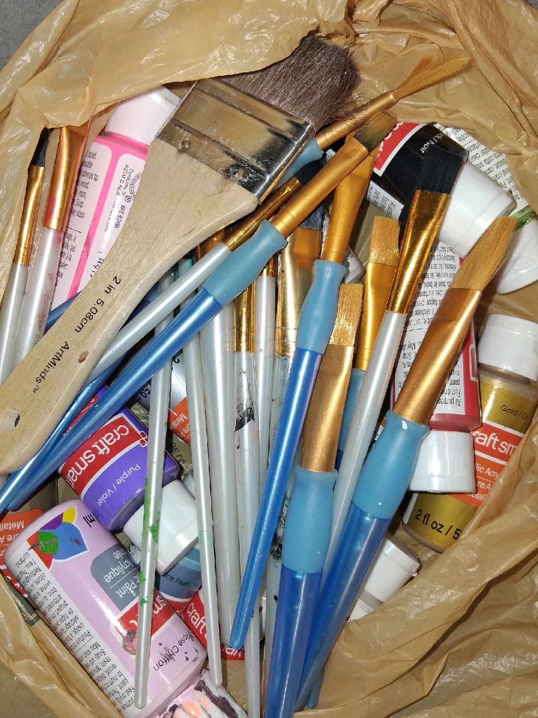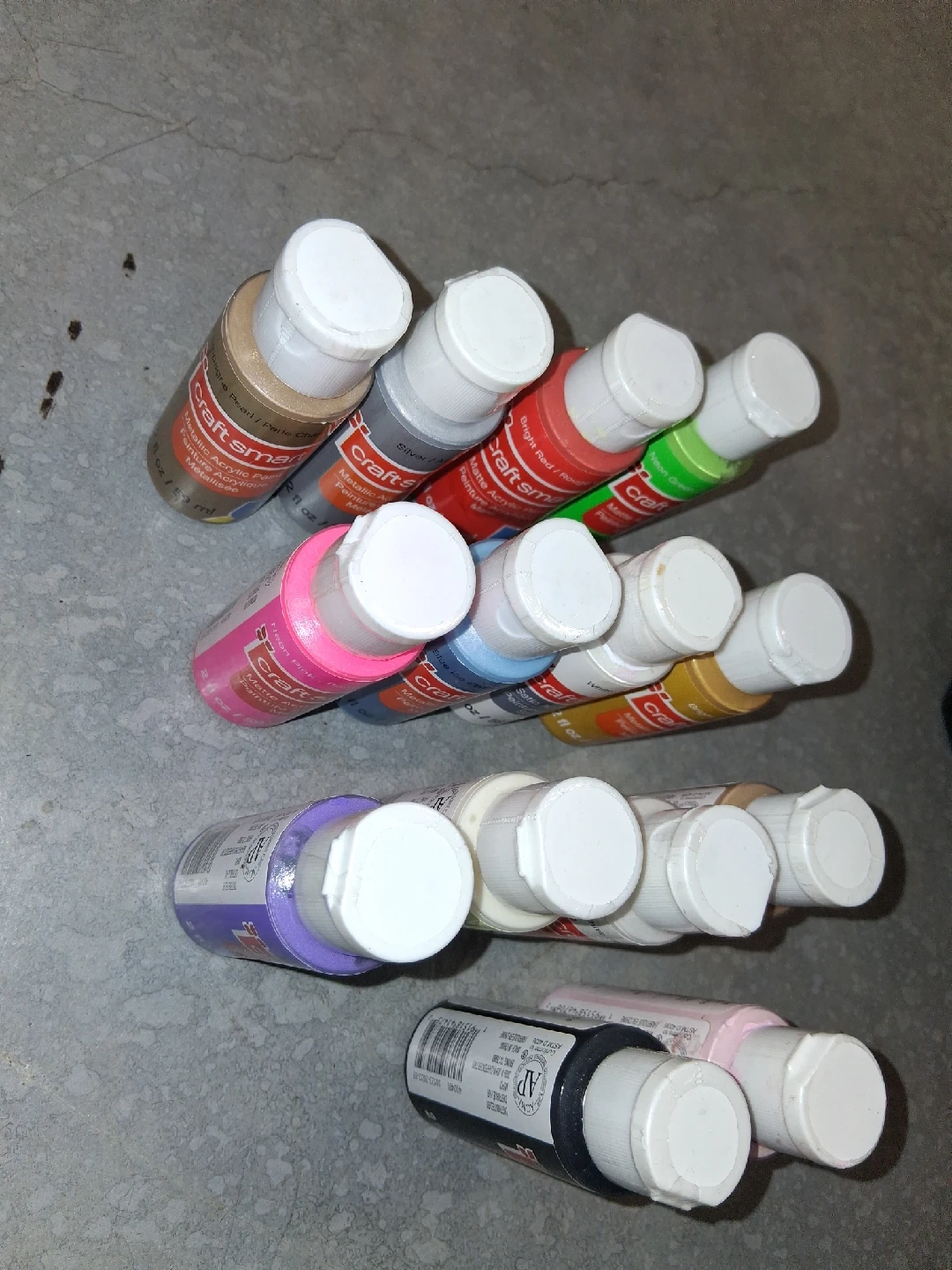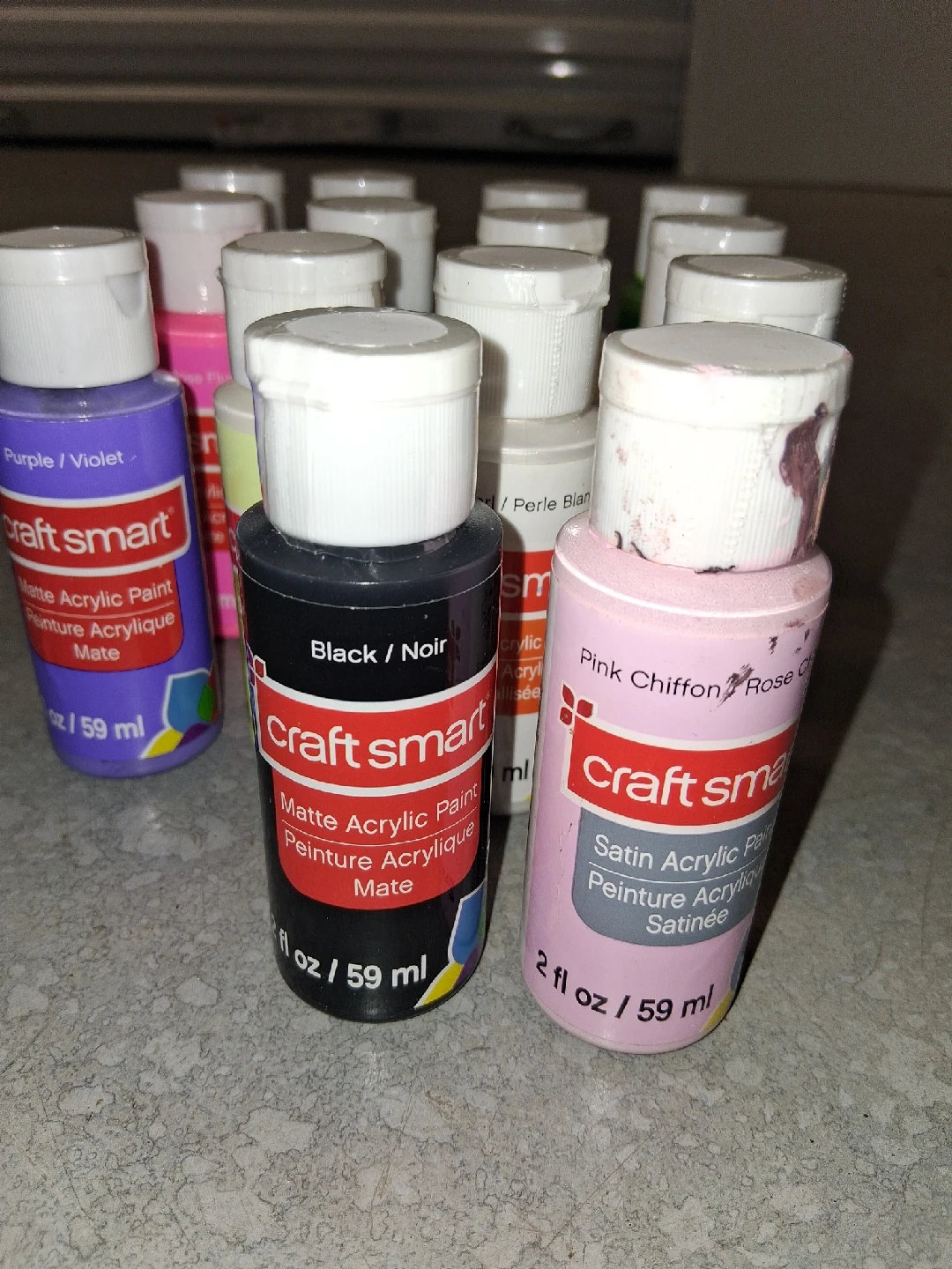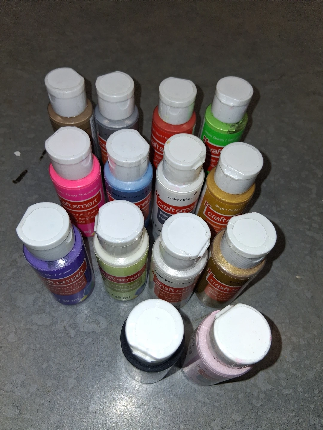65Selling a collection of Craft Smart acrylic paints in various colors, along with an assortment of paint brushes. Each paint bottle contains 2 fl oz / 59 ml of paint. Perfect for arts and crafts projects! these are used paints, most paint bottles has some paint in it