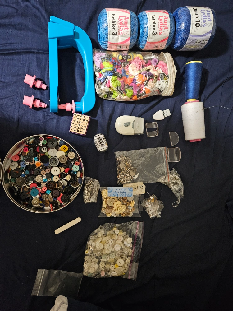 160Assorted craft supplies lot. Includes various buttons, crochet thread, and more small crafting tools and supplies for crafters and hobbyists.