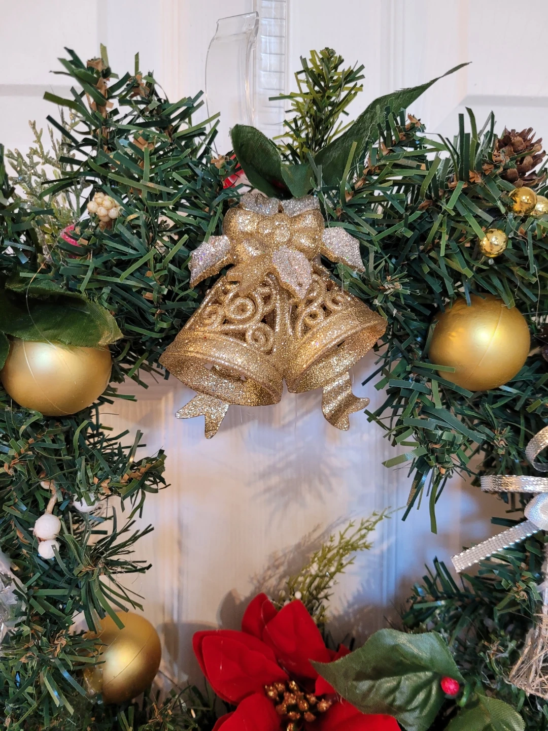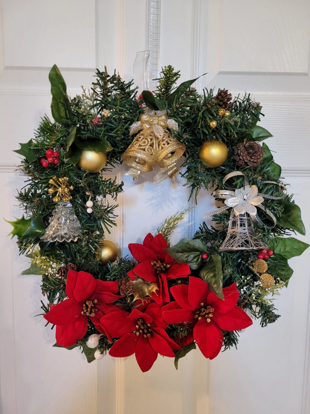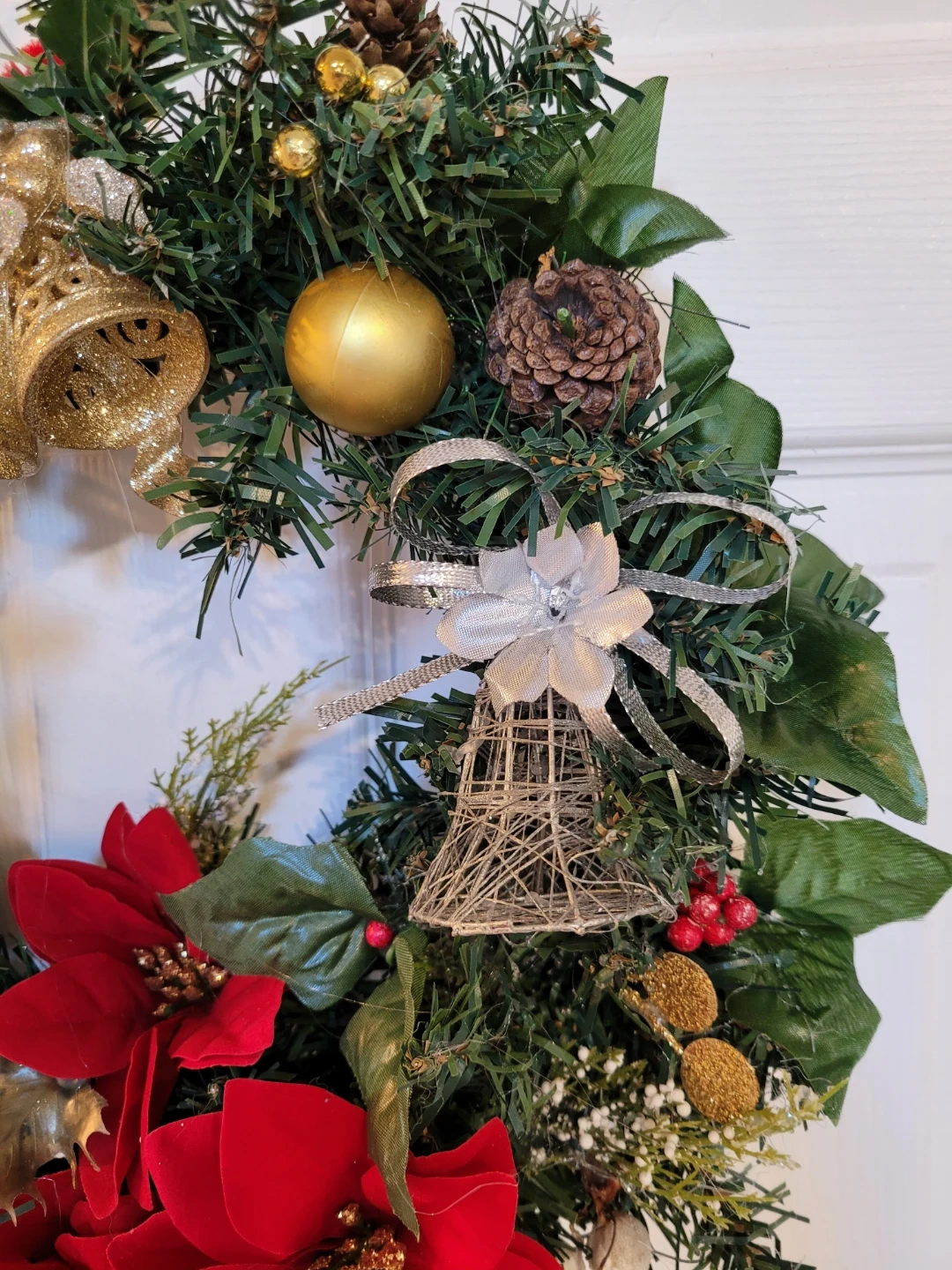 85Festive Crafted Christmas wreath featuring vibrant red poinsettias, gold ornaments, and decorative bells! Perfect for adding a touch of holiday cheer to your home this season. Feel free to check out my other unique items listed.