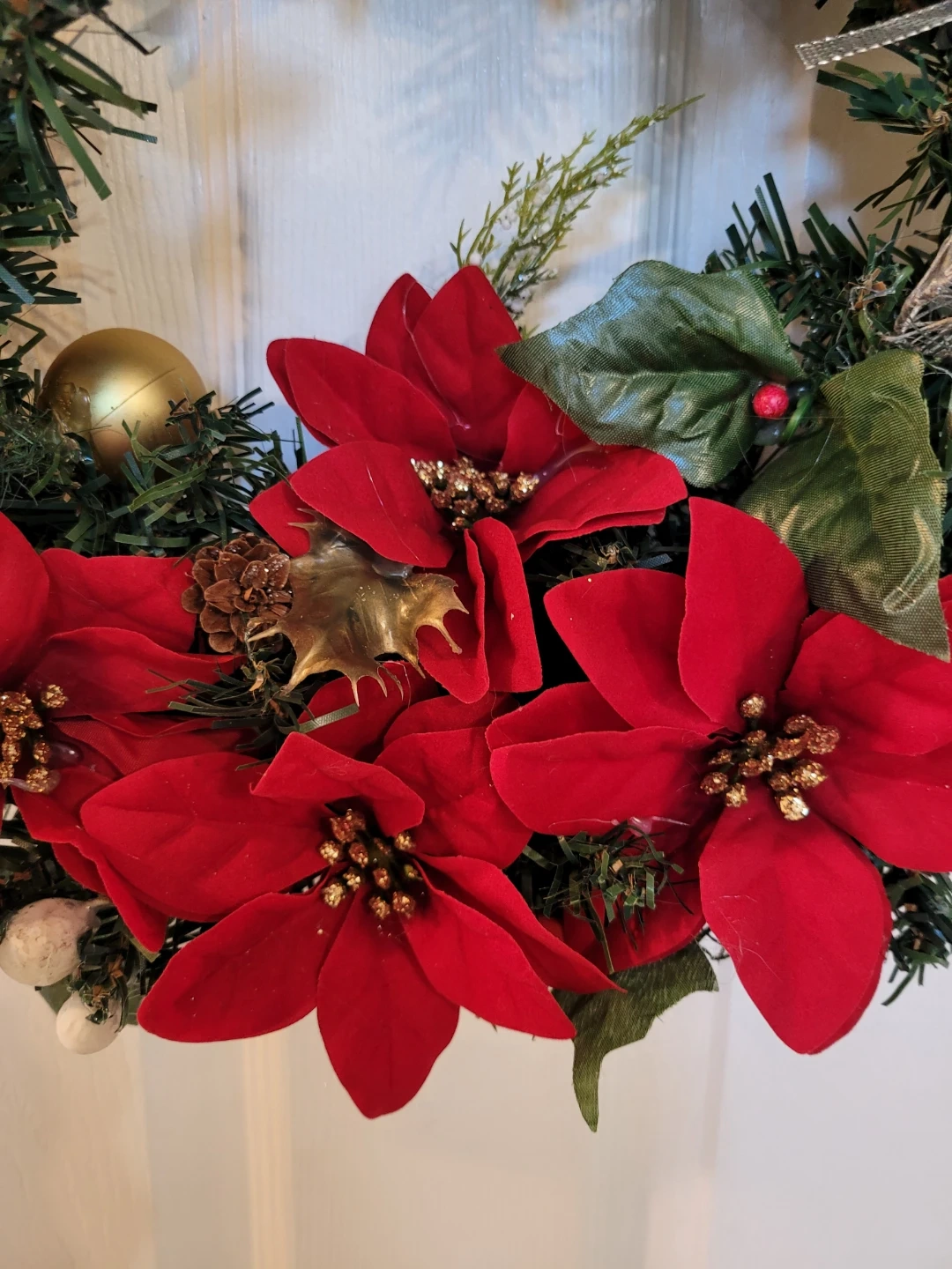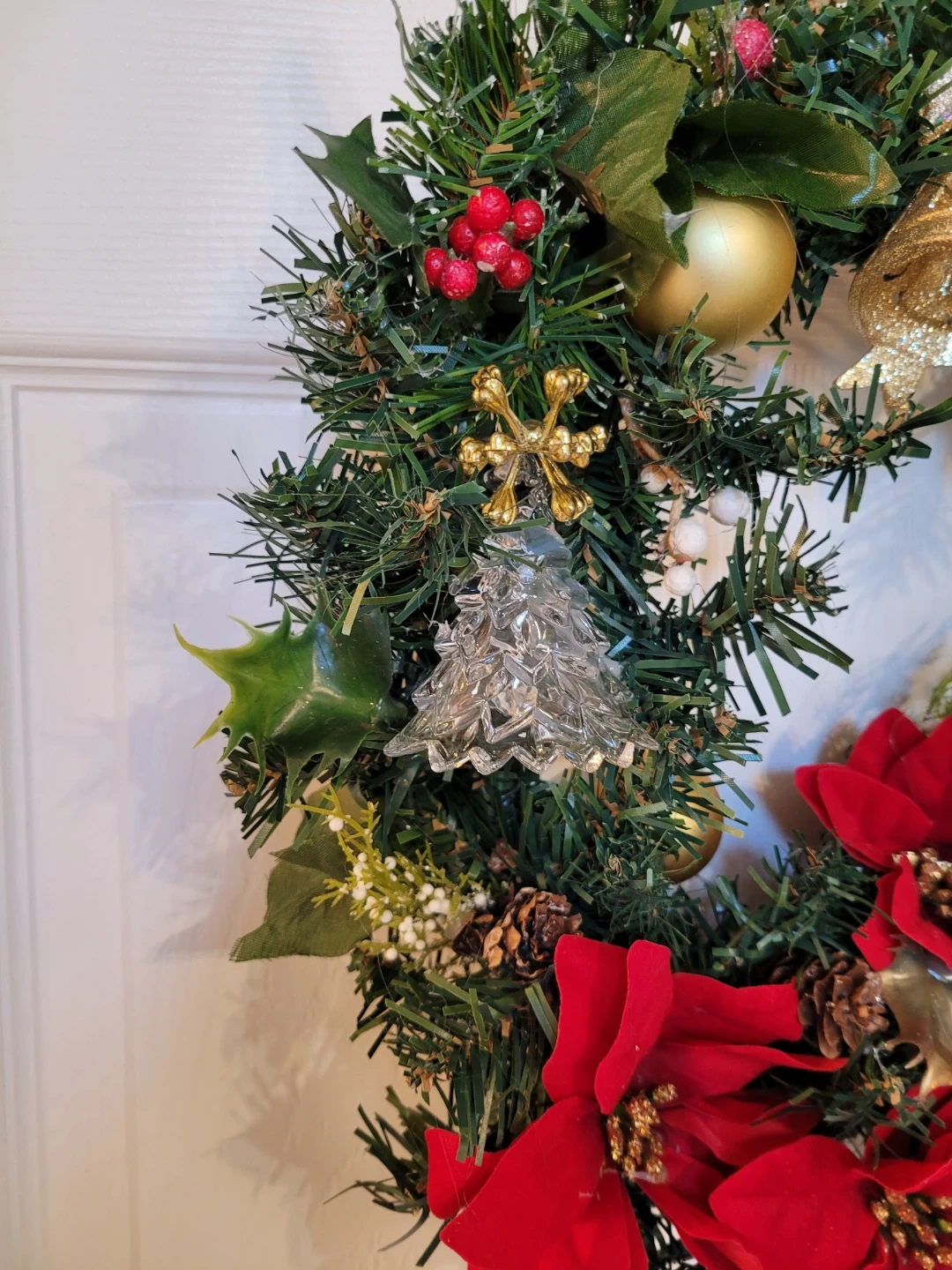 Crafted Christmas Wreath w/ Red Poinsettias & Ornaments