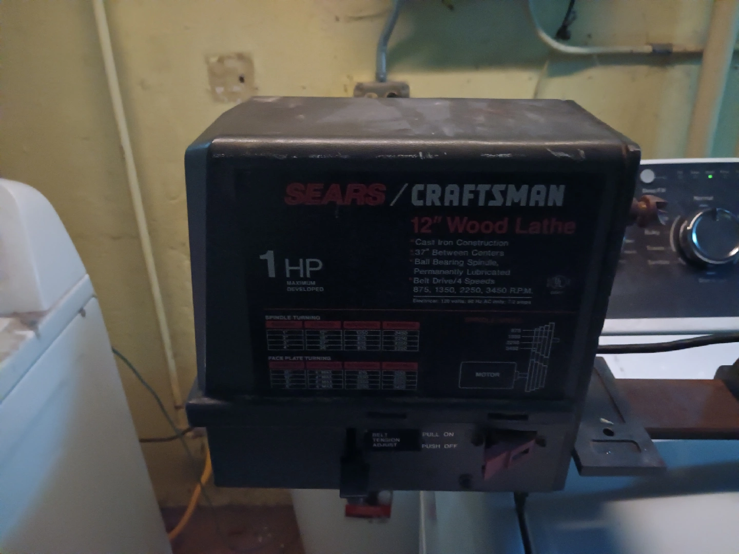 Selling a Craftsman 12" Wood Lathe. It features cast iron construction and a 37" between centers. It also has a ball bearing spindle and is permanently lubricated. There are belt drive/4 speeds: 675, 1350, 2250, 3450 RPM