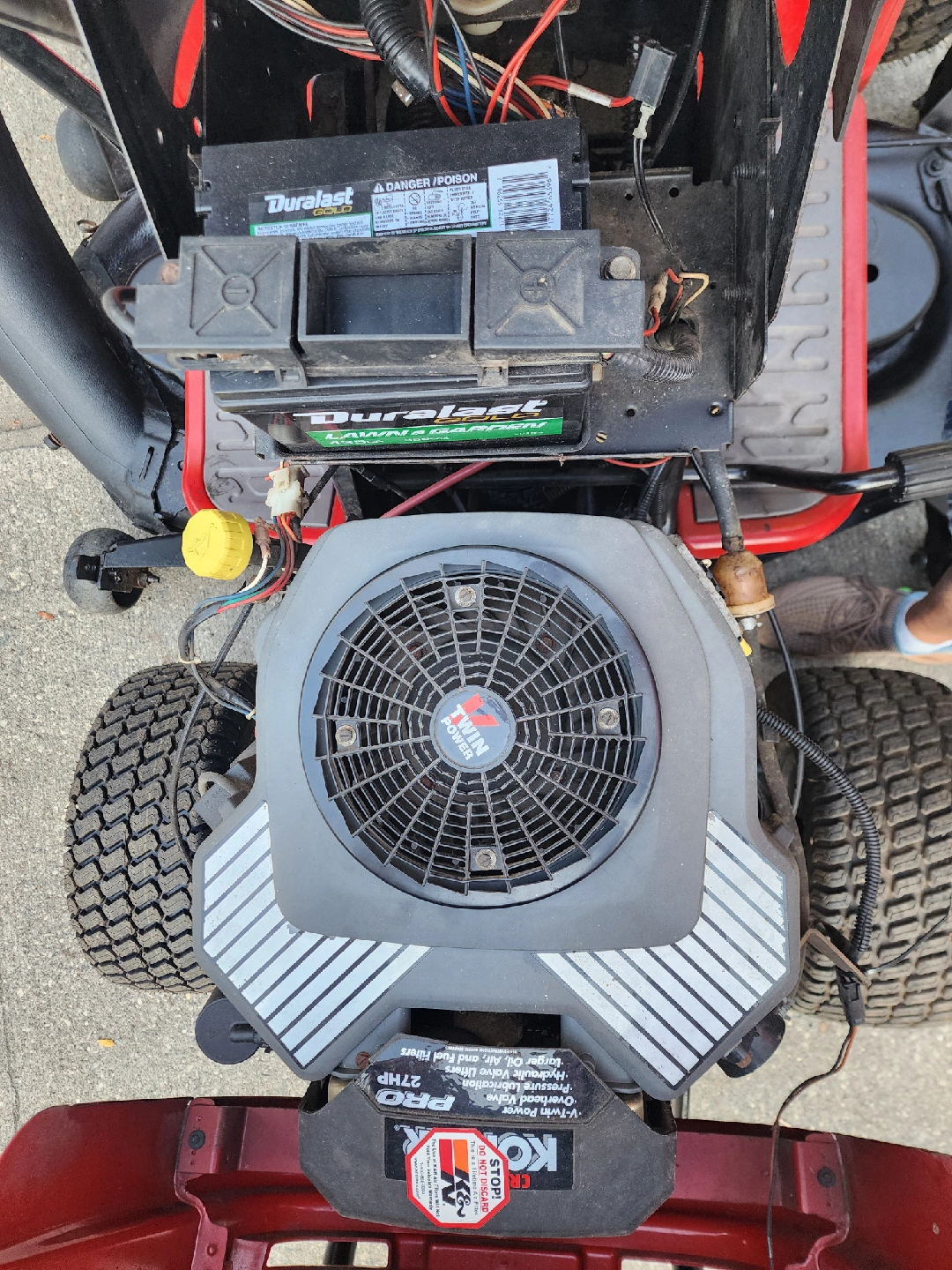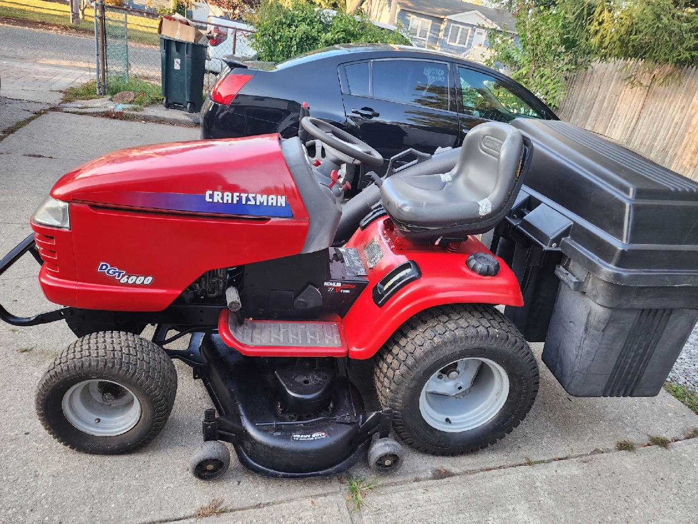 Selling a Craftsman DGT 6000 riding lawn mower. It's red and has a black collection bin in the back. Has a Kohler 27 HP engine.