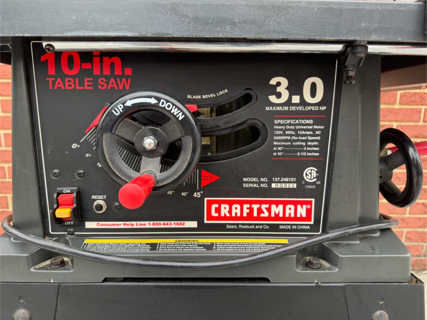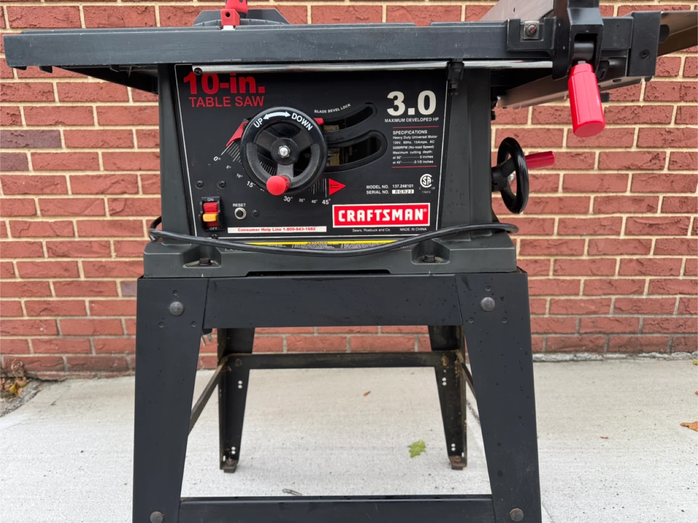 Selling a Craftsman 10-inch table saw. It has a 3.0 Maximum Developed HP motor. Model number is 137.41503. Serial number is A06851. It is in used condition.