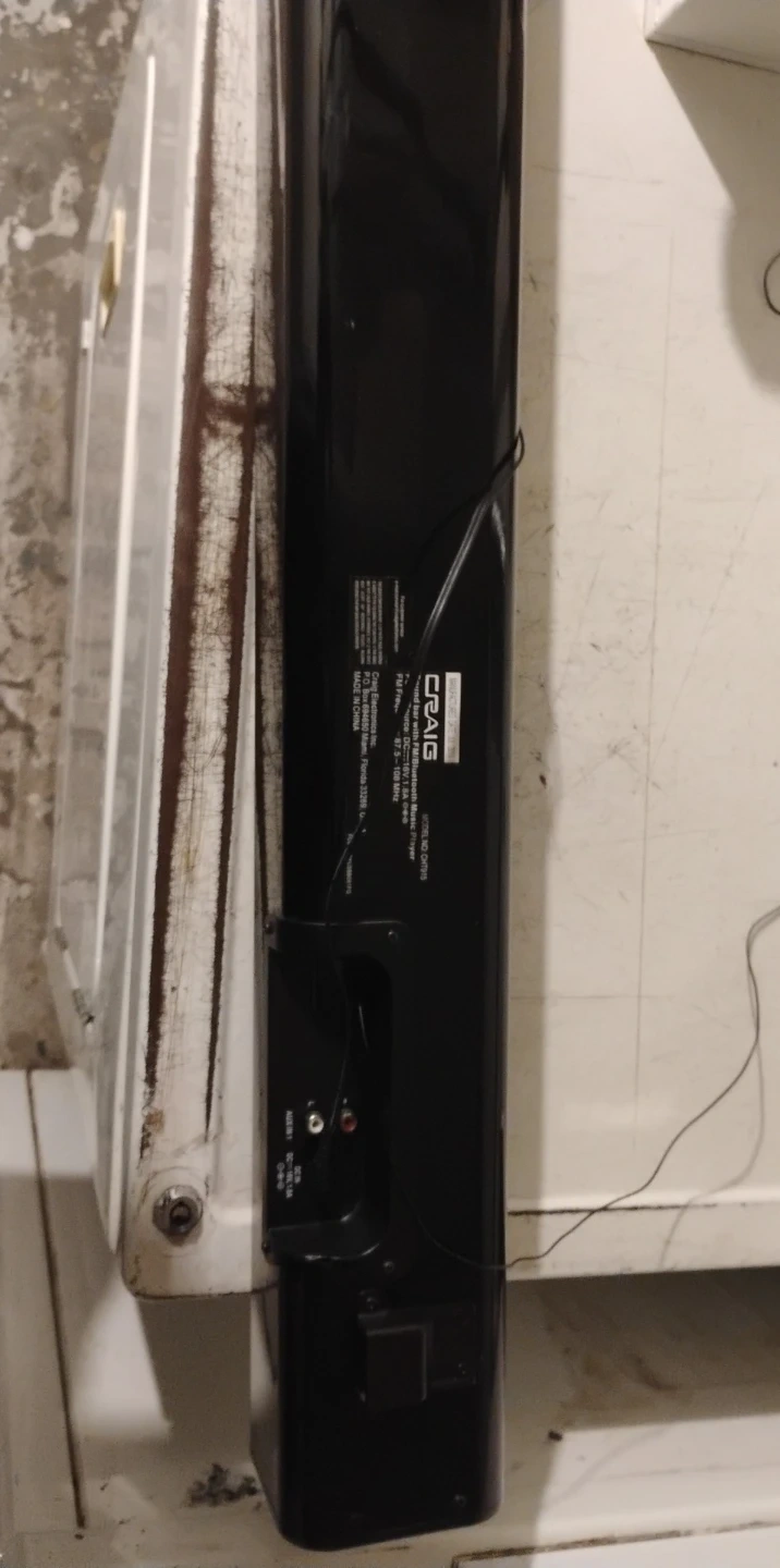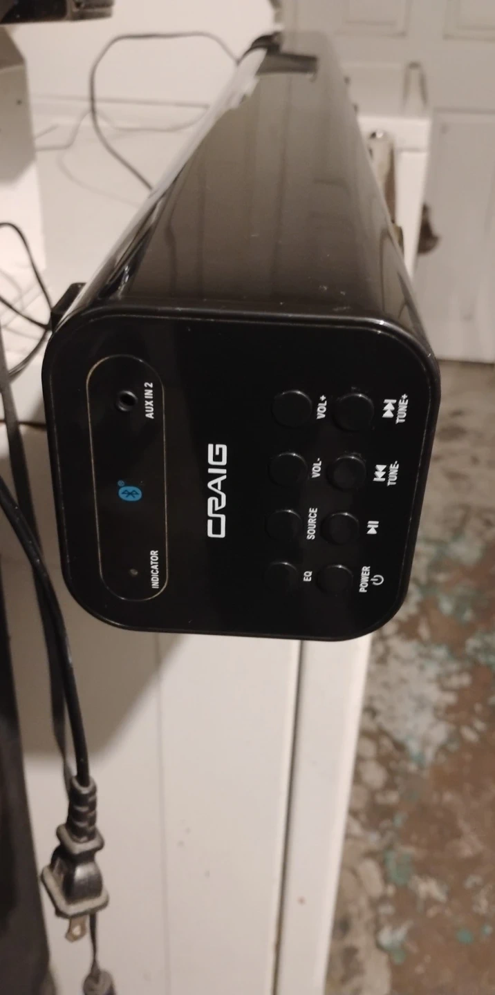 10Selling a Craig soundbar. It has AUX in 2, indicator, VOL+, source, EQ, and power buttons. and Bluetooth capability. Craig cht915 Bluetooth with am/FM radio tower speaker system asking $20 for it has no remote control. Selling as is NO TRADES JUST CASH