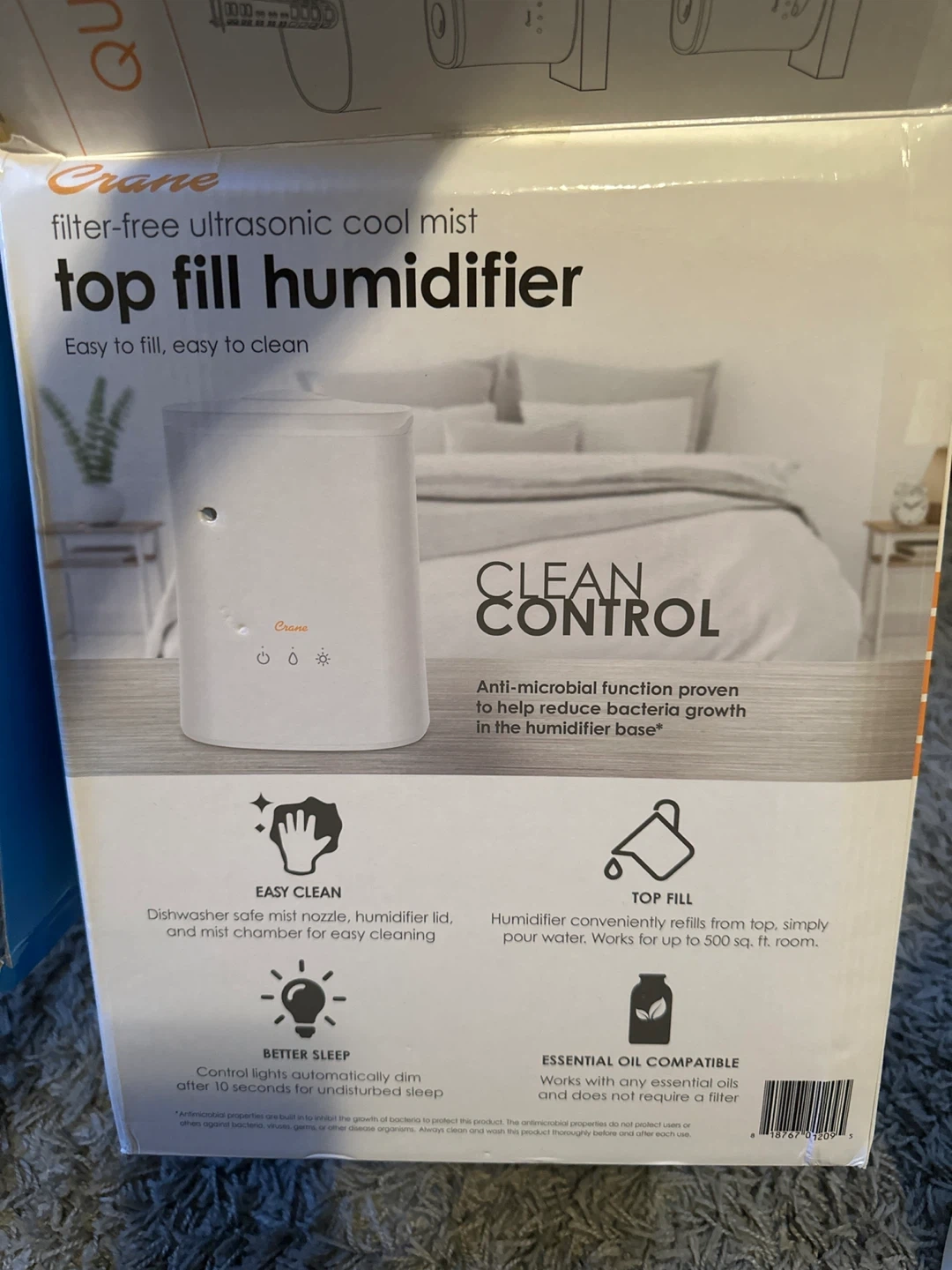 60Selling a Crane top fill humidifier. It's easy to fill and clean, with a dishwasher-safe mist nozzle and humidifier lid. It also has anti-microbial protection to help reduce bacteria growth. The humidifier conveniently refills from the top, simply pour water and works for up to 500 sq ft. It also has control lights that automatically dim after 10 seconds for undisturbed sleep and is essential oil compatible