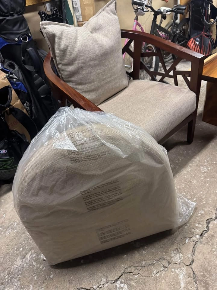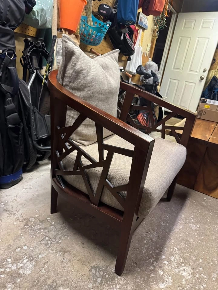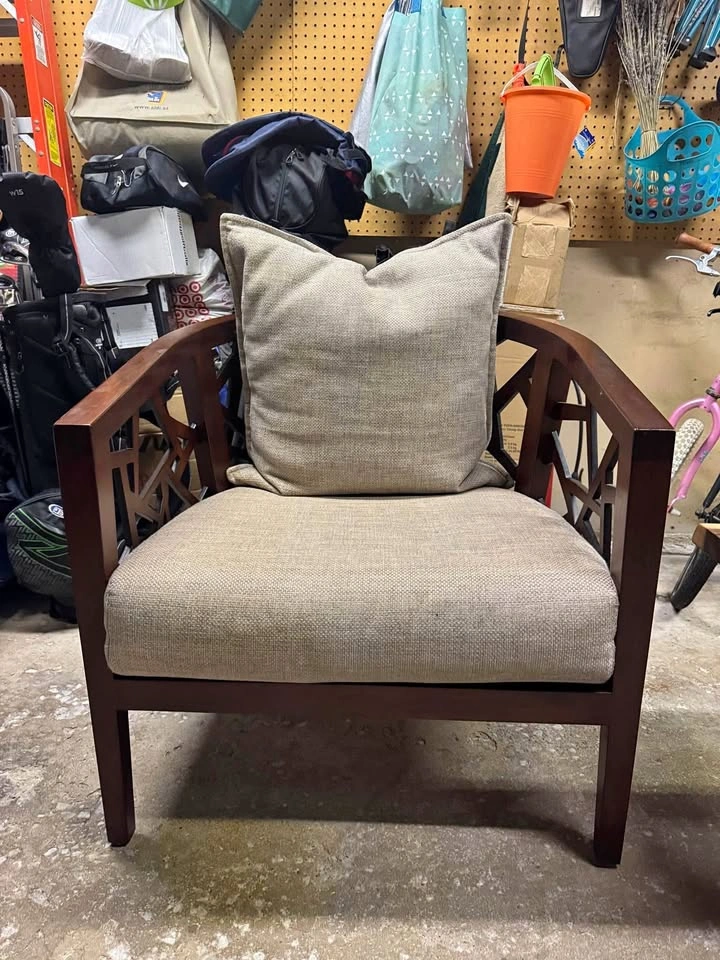 6525D x 29"W x 31"H. Seat height 16". Crate and barrel armchair. Had it for a while but was in sitting room where it was rarely used. I will throw in an extra seat cushion as well. Only stored in the garage right now to make way for new furniture and for easy pickup. Comfortable and stylish. Pickup in Chicago near Cumberland & Irving.