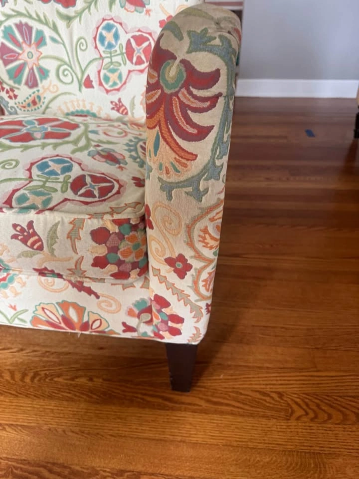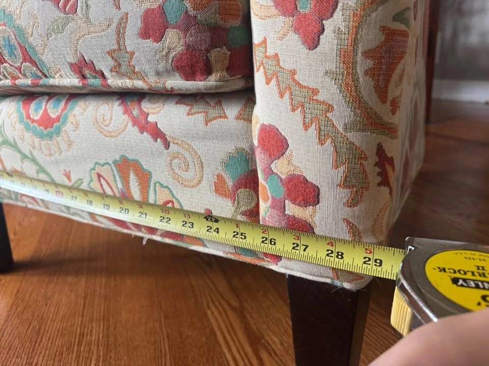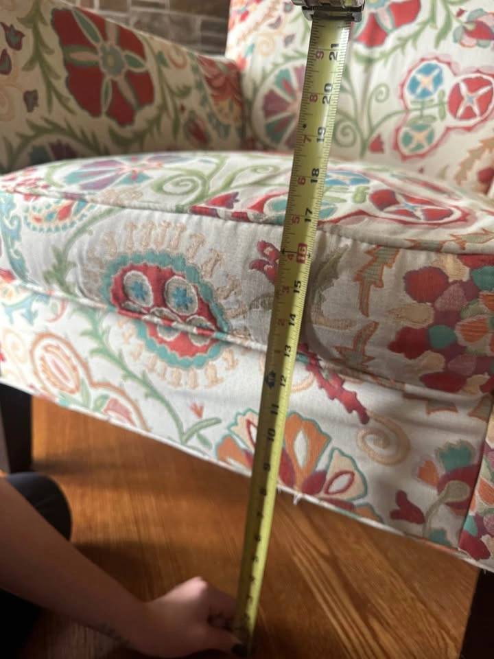 65This armchair is 15 years old but still looks and sits great. Could use a shampoo but I didn't notice that until I started taking pix of it. Watch the video for details. ~29"L x ~ 27"W x ~34"H Back is curved so it is a bit wider at the top than 27". I measured from the arm to the back to get 27".