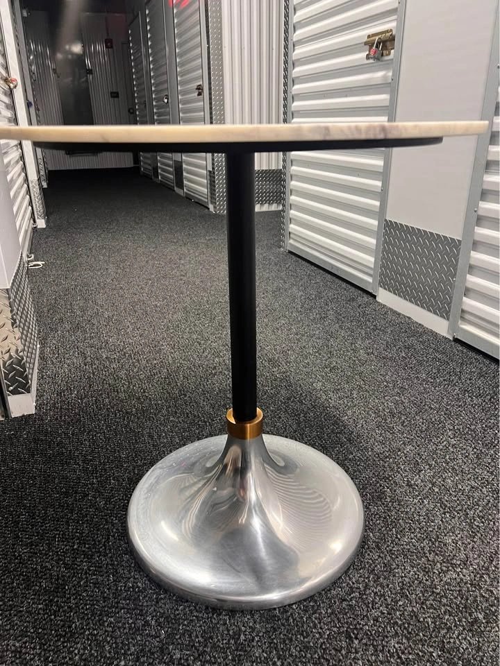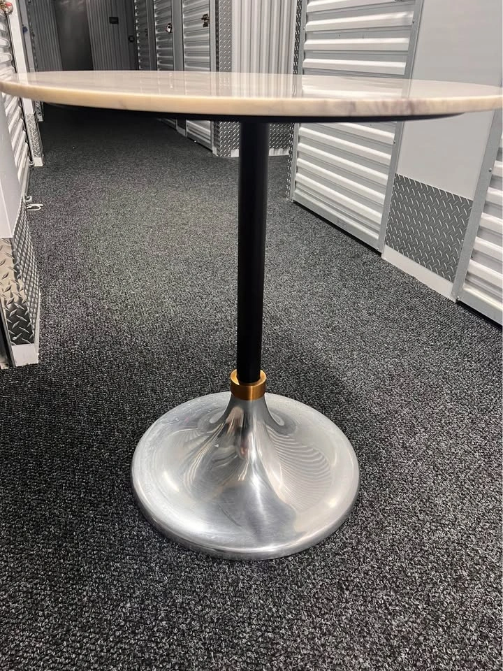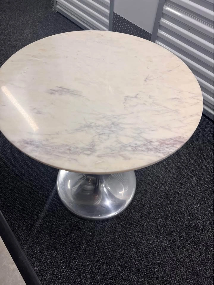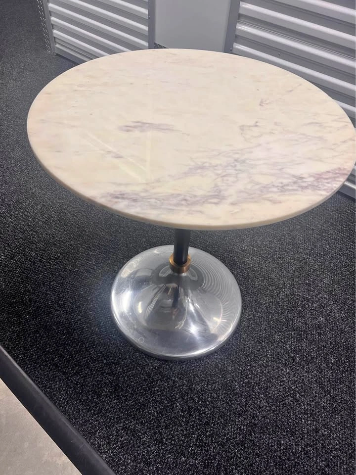Stylish and modern round side table featuring a sleek marble top and sturdy metal base with chrome and gold accents. Perfect as an accent table, coffee side table, or nightstand. The neutral design makes it versatile for any living room, bedroom, or office space. Condition: Gently Used – In excellent condition with minimal signs of wear. Must be able to pick up