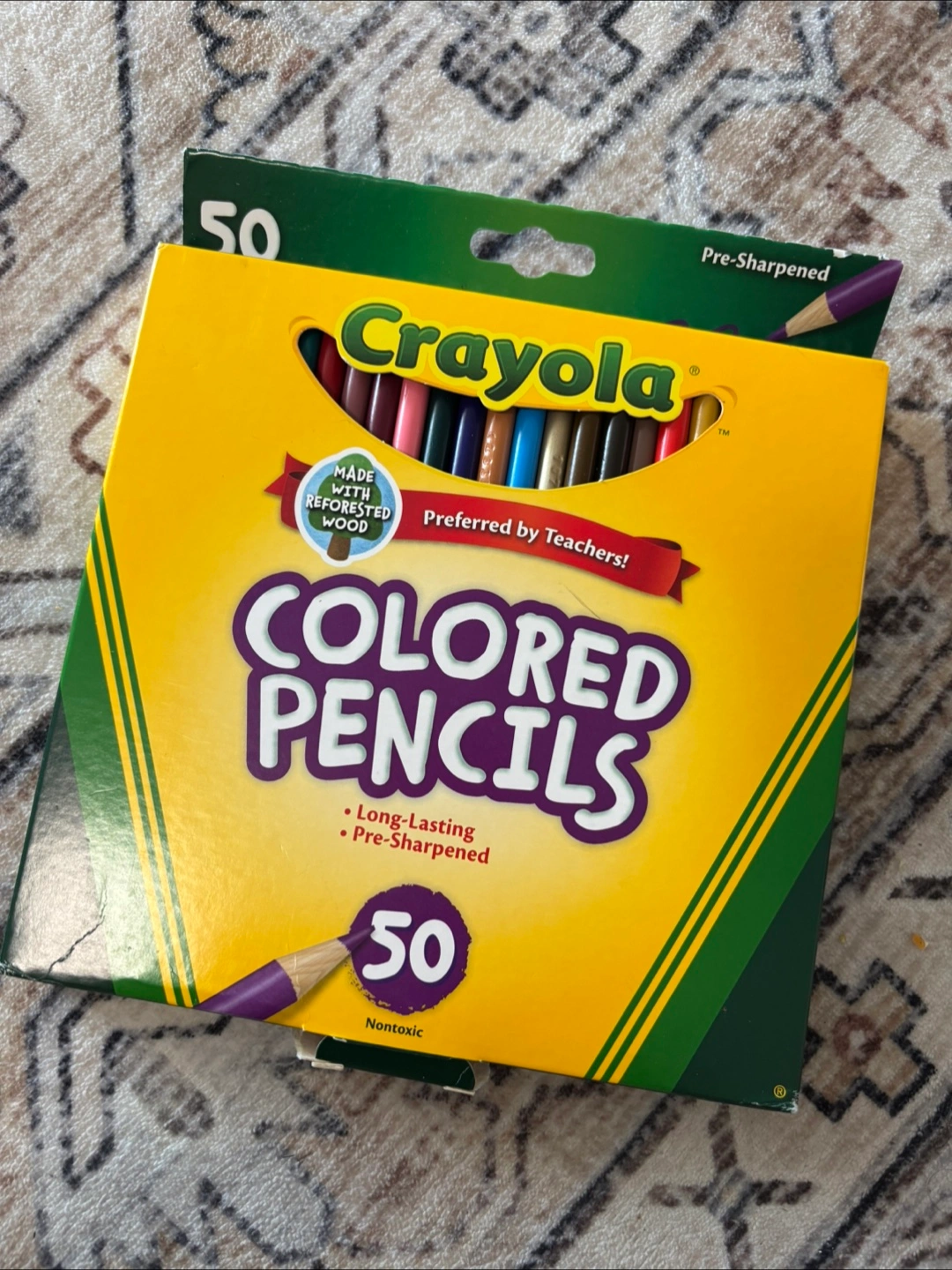 97I'm selling a box of Crayola Colored Pencils! This set comes with 50 pre-sharpened pencils. The pencils are made with reforested wood and are preferred by teachers. They're also long-lasting and non-toxic