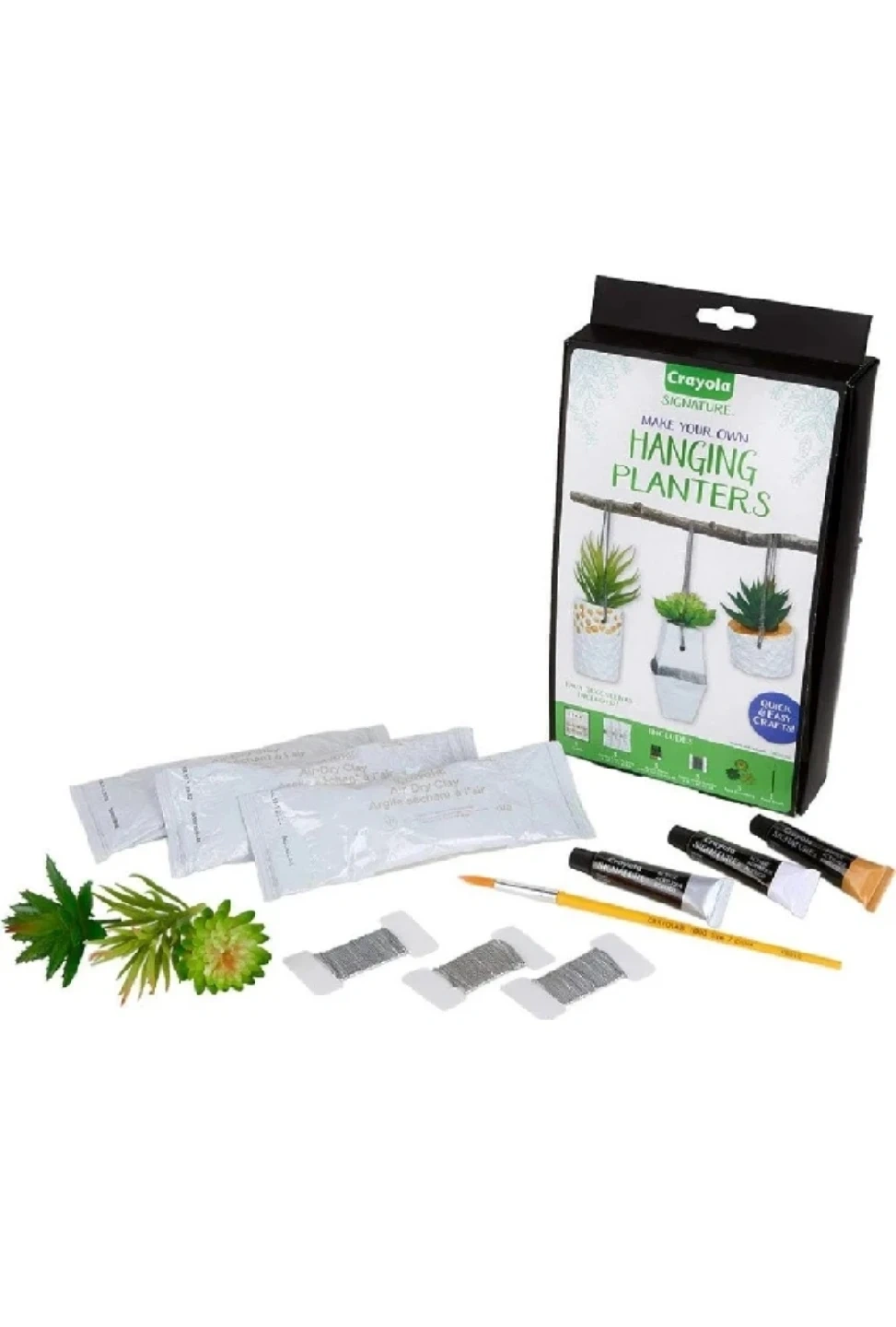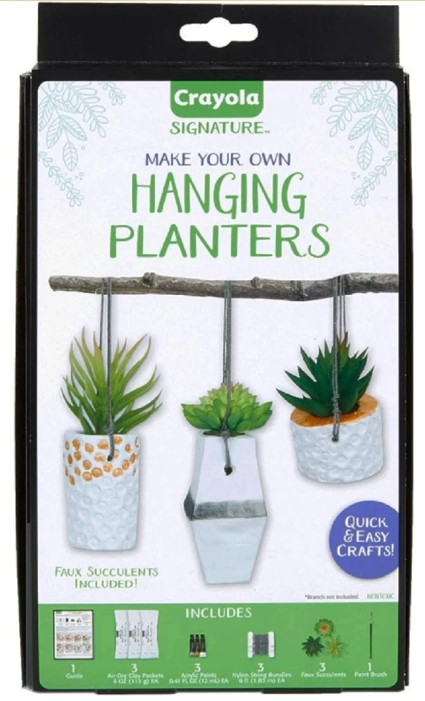 24Get crafty with this Crayola Signature DIY craft kit! It includes everything you need to create 3 hanging planters, including: - 3 packets of air-dry clay - 3 acrylic paints (gold, silver, white) - Nylon string - Faux succulents - Paintbrush - Guide It's a quick and easy craft, perfect for adults who love plants and crafts