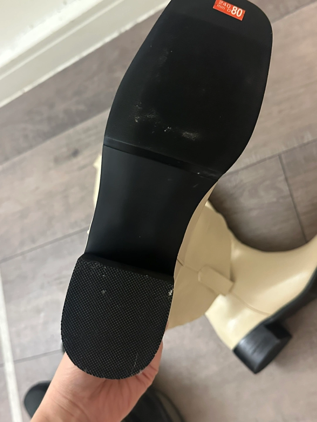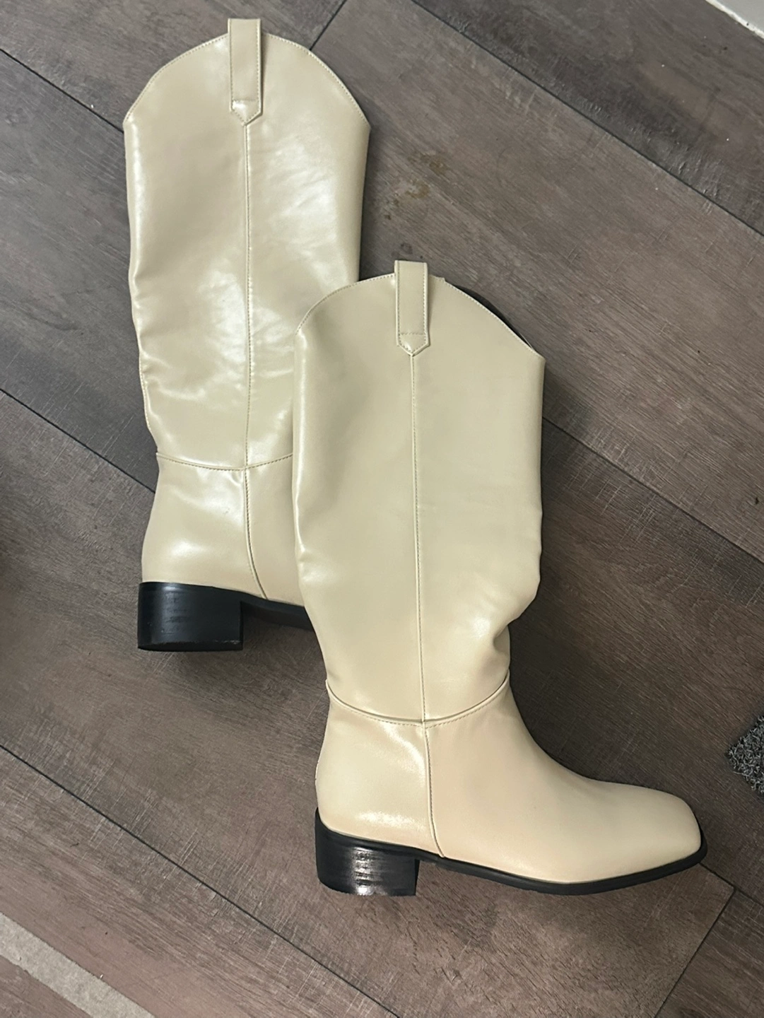 Pair of cream-colored tall boots. Block heel. Slight wear on soles. Size 7