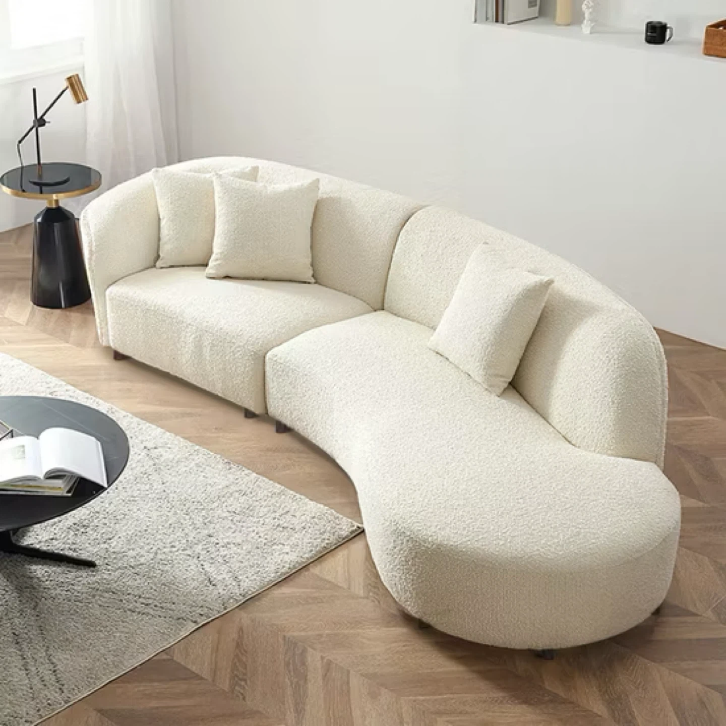 Selling a cream-colored curved sectional sofa. It's a stylish and comfortable piece for any living space. The sofa features a unique curved design and comes with matching throw pillows.