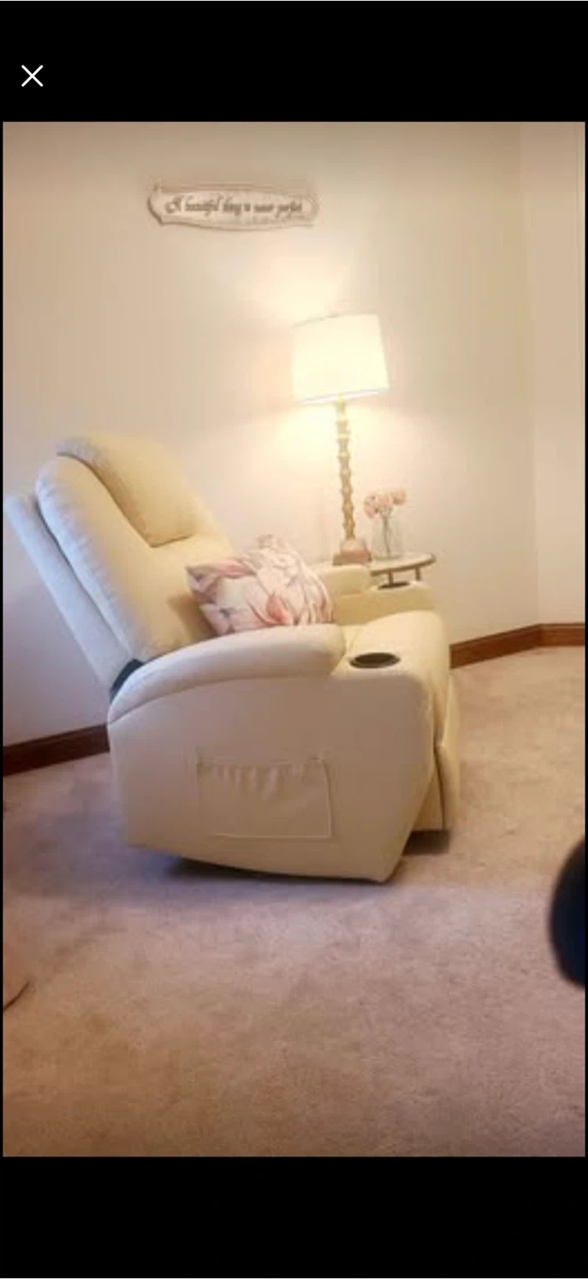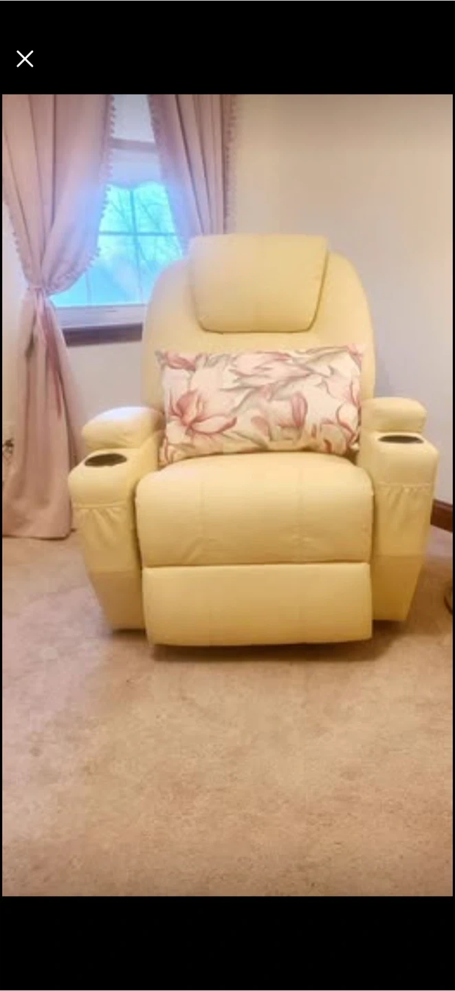 60I'm selling a cream-colored leather manual recliner chair. Like new, never used. Has been sitting in our exercise room. Heated & swivels 360 degrees. It's a beautiful modern cream Recliner and would be a great addition to any living room or bedroom. It features a comfortable headrest, armrests, and even cup holders for ultimate relaxation