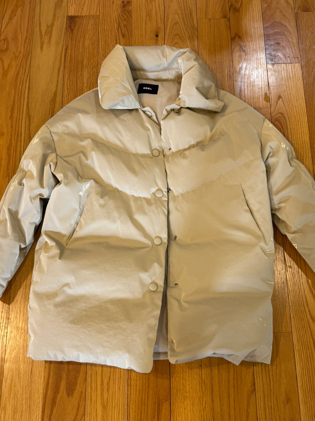 Cream-colored puffer jacket. Snap button closure. Oversized fit. Shiny finish.