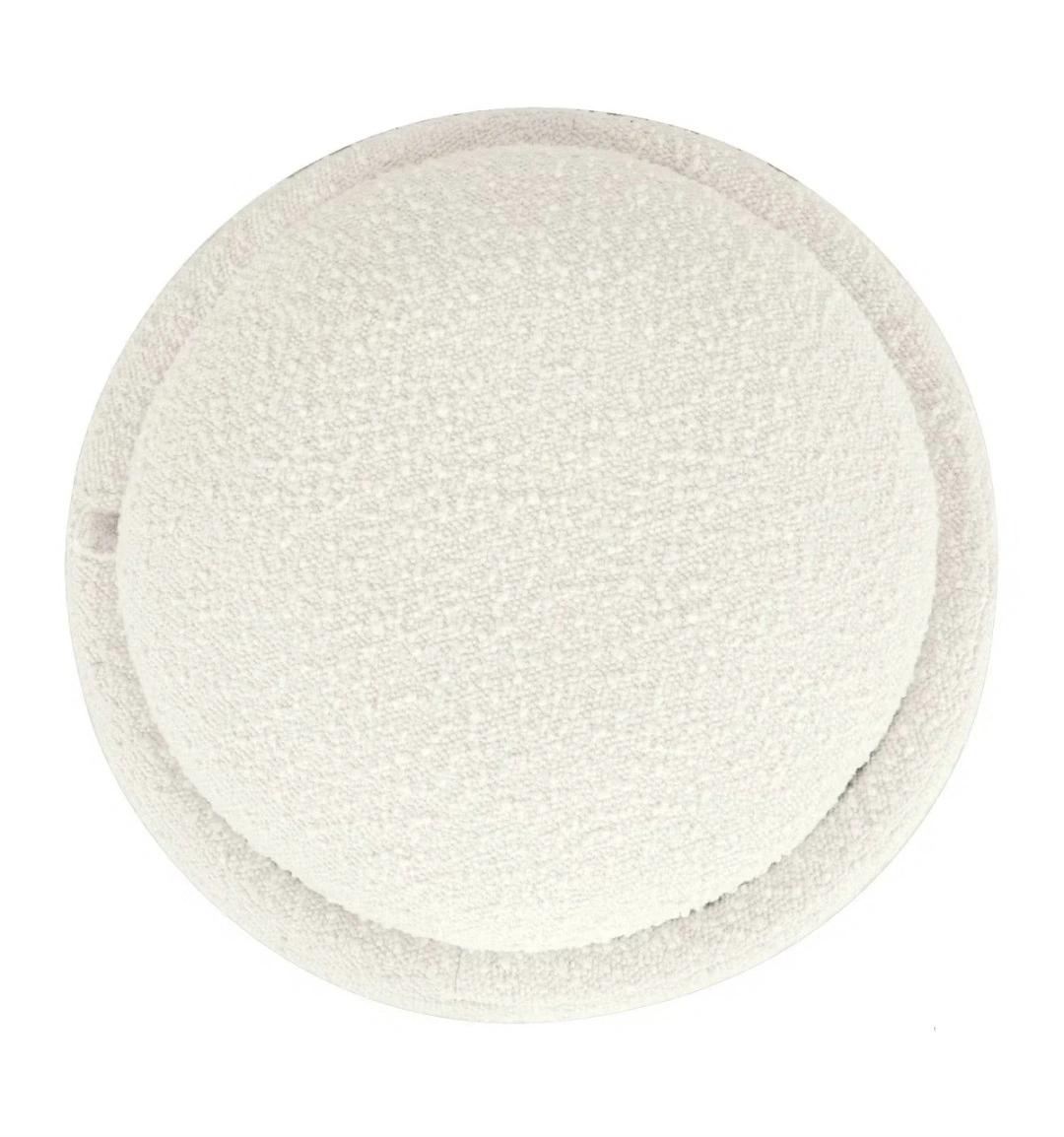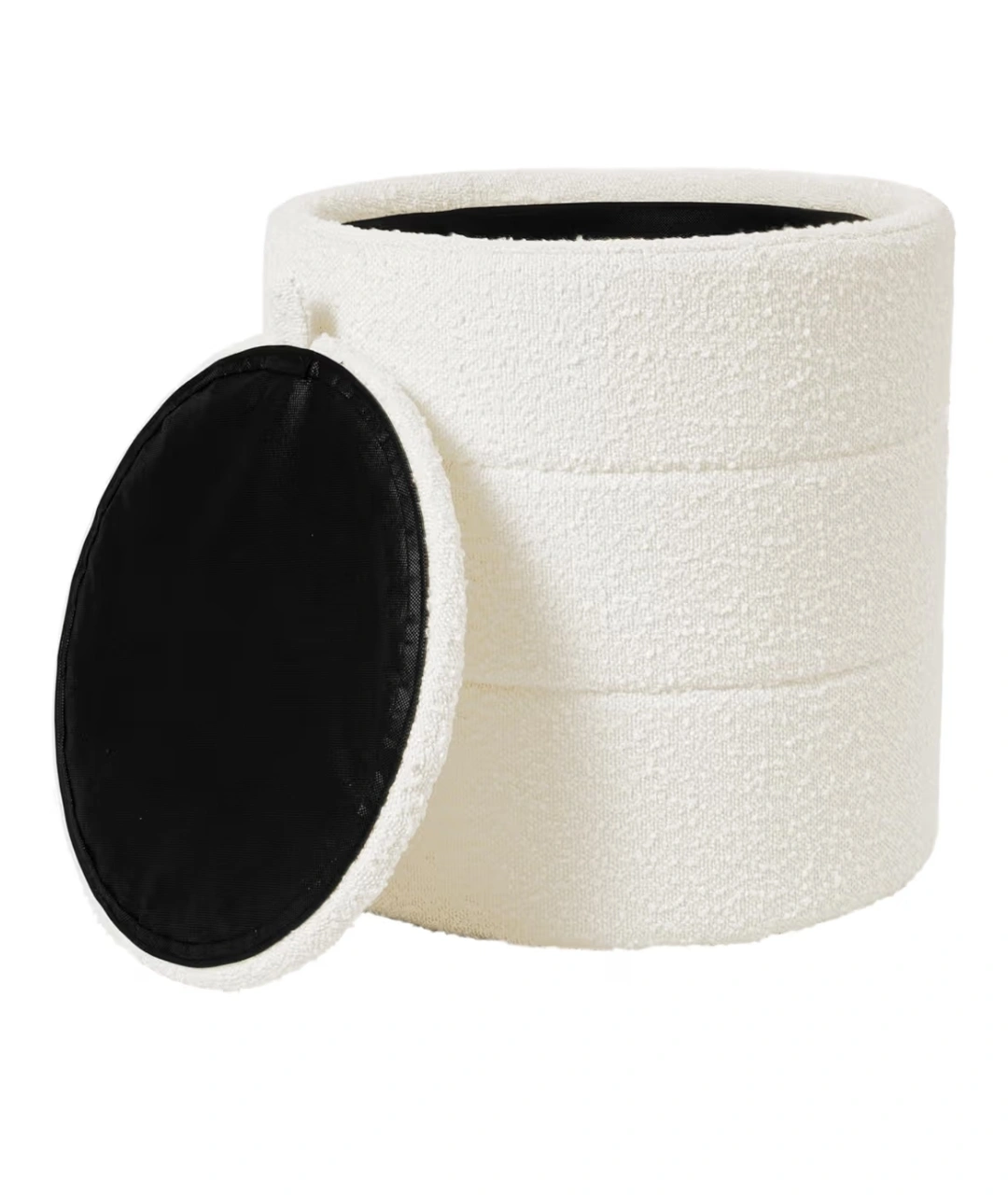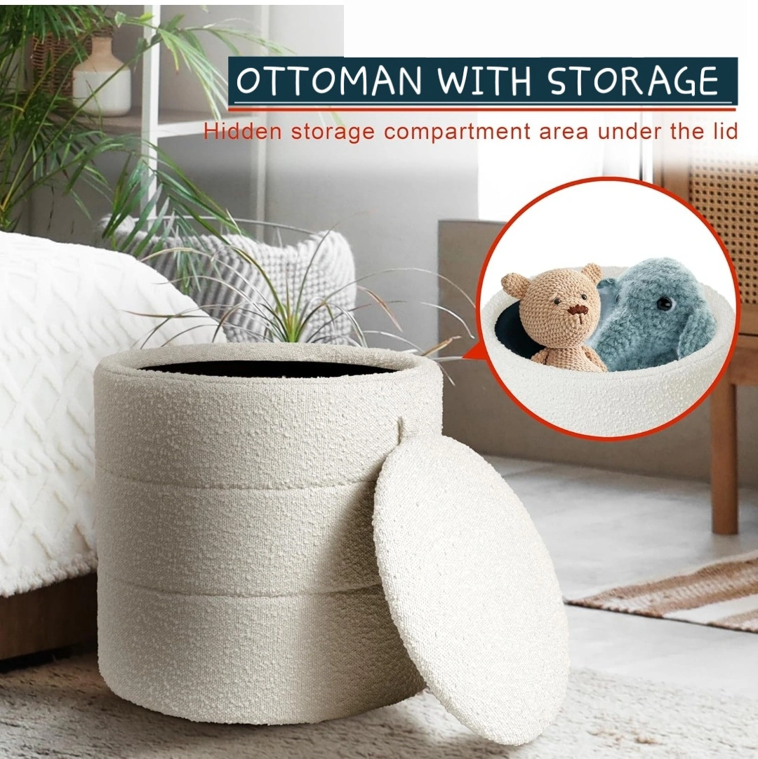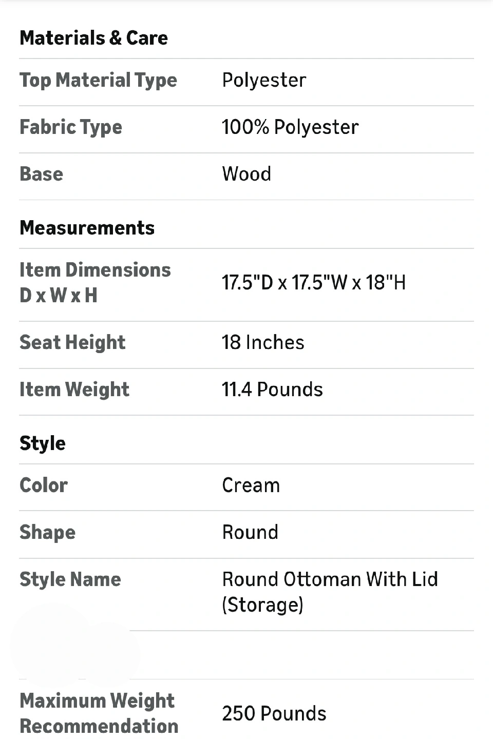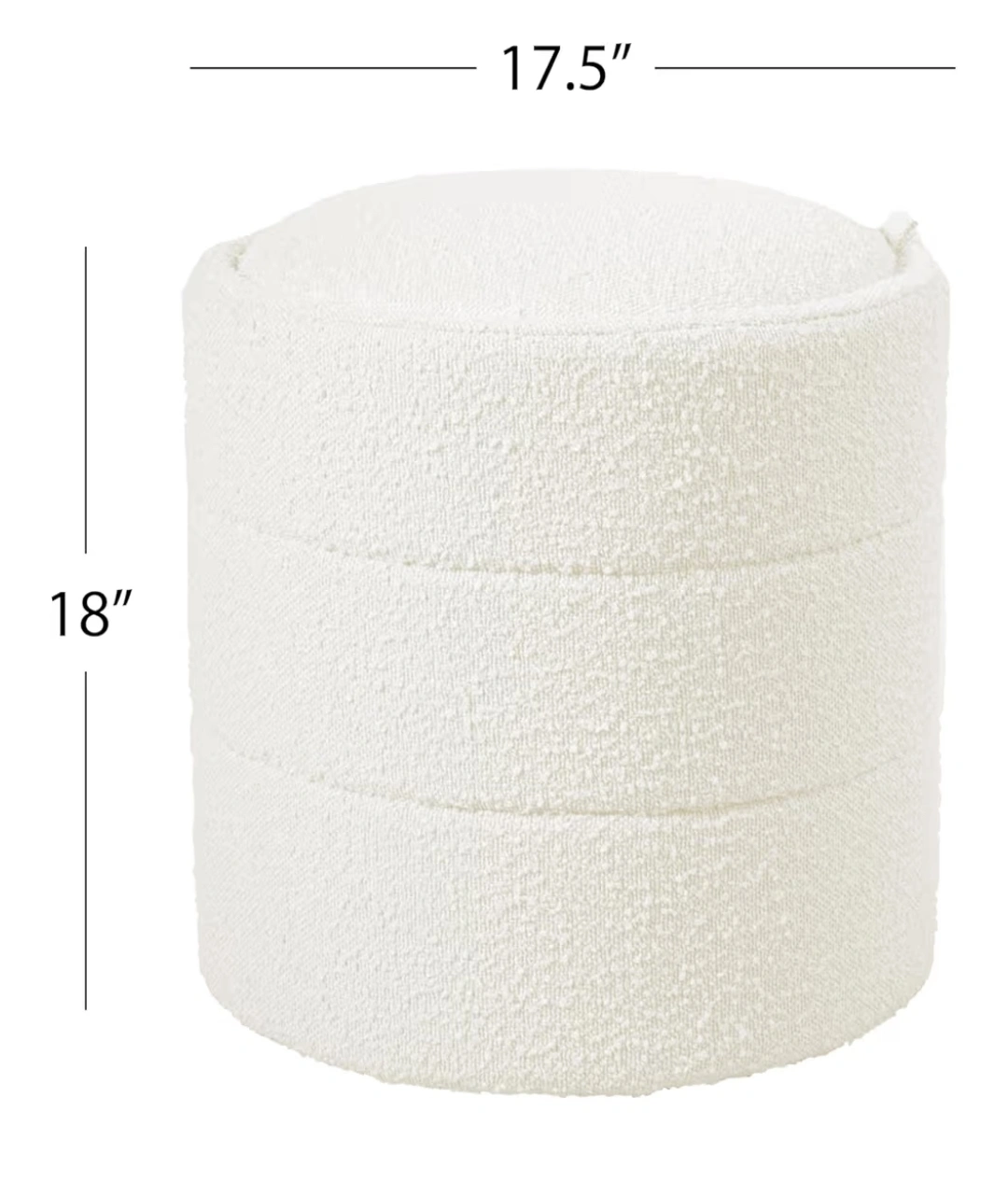 12This is a cream-colored boround ottoman with storage. It features a hidden storage compartment under the lid. The dimensions are approximately 17.5 inches in diameter and 18 inches in height. Pair:$100